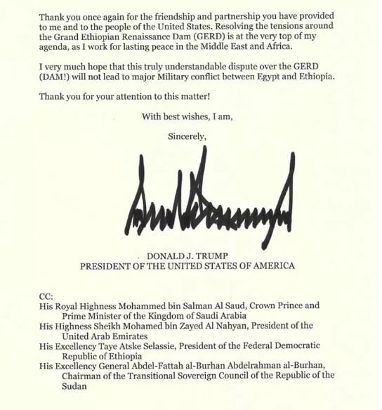ترامب: نأمل ألا يؤدي الخلاف القائم إلى صراع عسكرى بين مصر وإثيوبياواختتم الرئيس الأمريكى دونالد ترامب رسالته بالتأكيد على أن حل التوترات المتعلقة بسد النهضة الإثيوبى يأتى فى صدارة أولوياته، معربًا عن أمله فى ألا يؤدى الخلاف القائم إلى صراع عسكري بين مصر وإثيوبيا، ومؤكدًا حرصه على تحقيق سلام دائم فى الشرق الأوسط وأفريقيا.