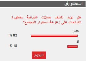 فى استطلاع للرأي طرحه اليوم السابع على قرائه الأعزاء تحت عنوان هل تؤيد تكثيف حملات التوعية بخطورة الشائعات على زعزعة استقرار المجتمع؟، أيد غالبية القراء مطالب تكثيف حملات التوعية بخطورة الشائعات على زعزعة استقرار المجتمع.
