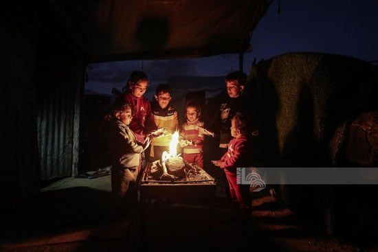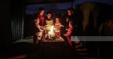 الأطفال يلتفون حول النار للتدفئة من برد الشتاء القارص