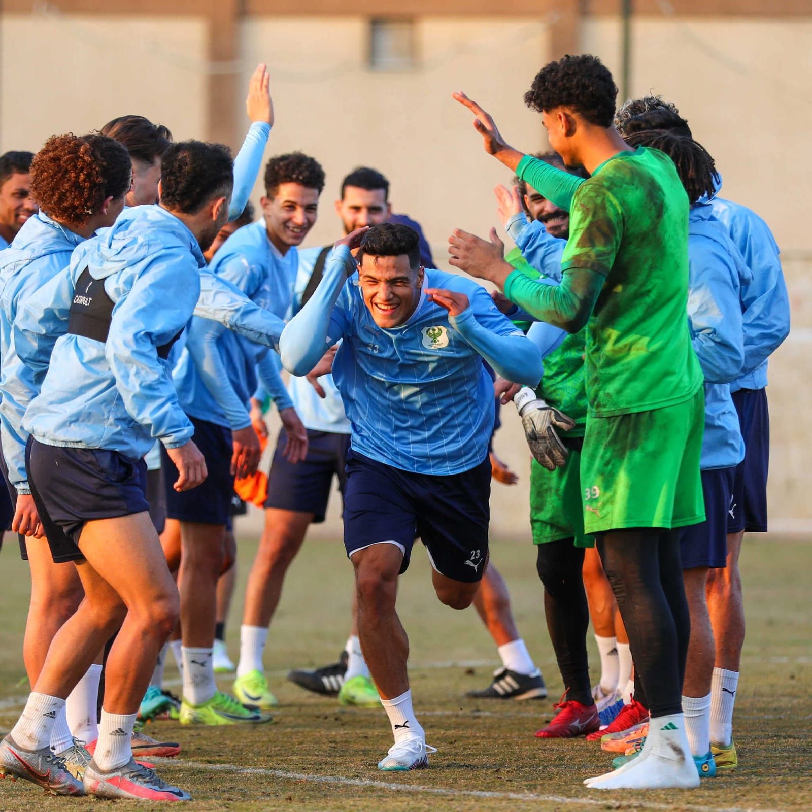 مصطفى العش يتلقى التحية من زملائه بالمصرى