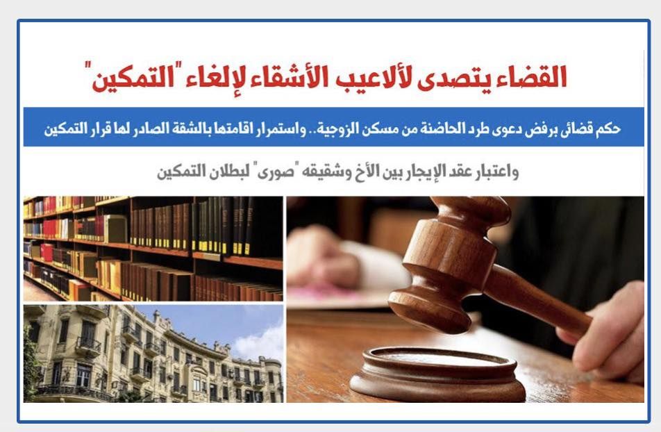 القضاء يتصدى لألاعيب الأشقاء لإلغاء قرارت التمكين.. حكم قضائى برفض دعوى طرد الحاضنة من مسكن الزوجية.. واستمرار اقامتها بالشقة الصادر لها قرار التمكين.. واعتبار عقد الإيجار بين الأخ وأخيه "صورى" لإبطال التمكين