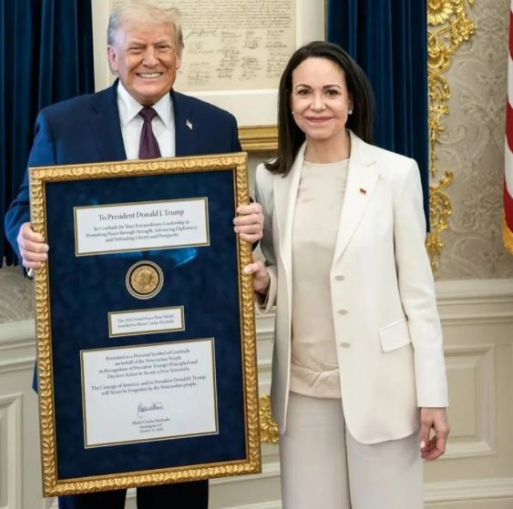 وكتب ترامب على منصته "تروث سوشيال": "قدمت لي ماريا جائزة نوبل للسلام التي حازتها تقديراً للعمل الذي أنجزته. يا لها من لفتة رائعة تعكس الاحترام المتبادل. شكراً يا ماريا".