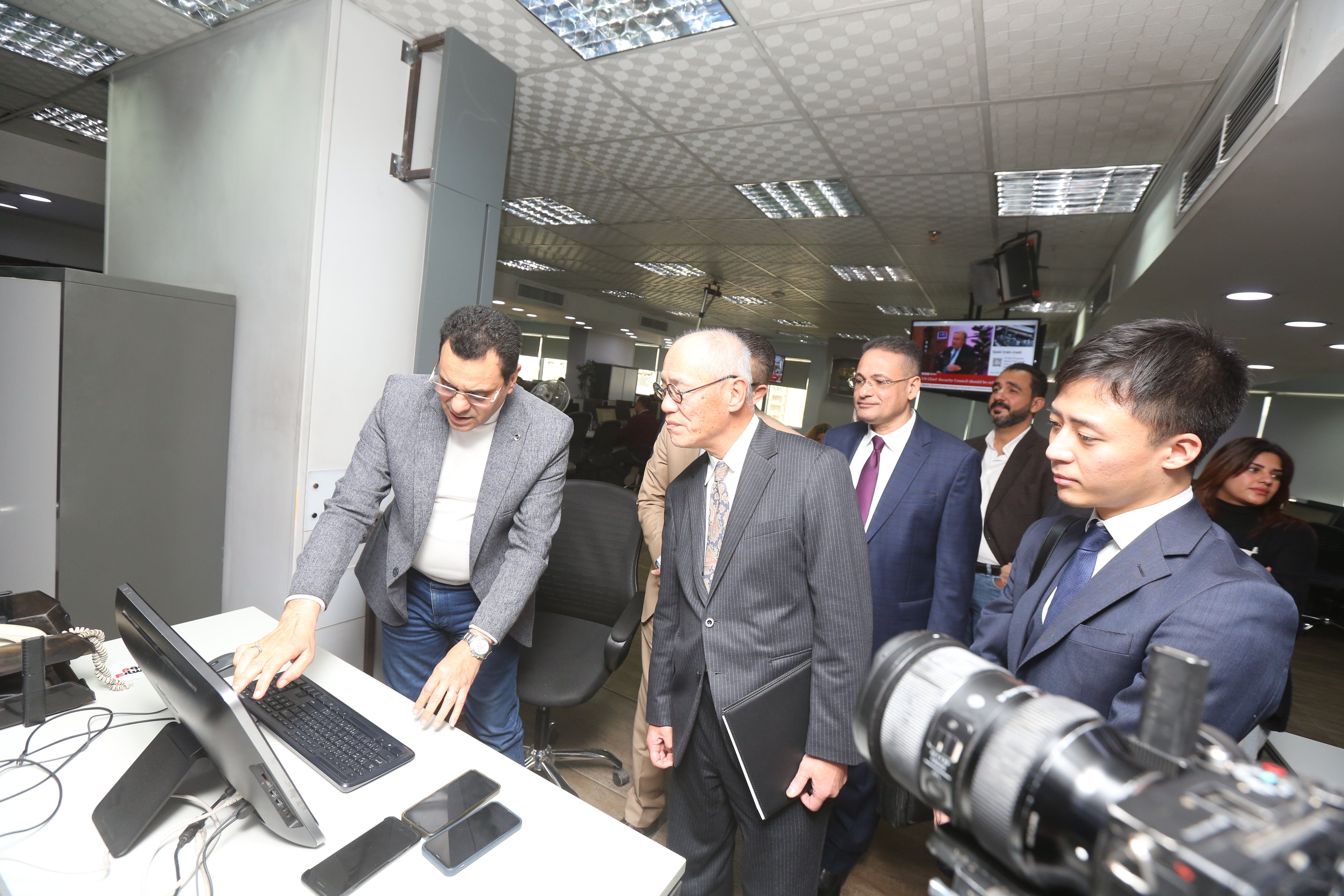 وأطلع السفير إيواي على دورة العمل فى مقر الجريدة، حيث تفقد أقسام الجريدة المختلفة وتحدث مع الصحفيين واستفسر عن طبيعة عملهم فى الموقع الإلكترونى والنسخة المطبوعة والاستديو والتلفزيون، وشرح رؤساء التحرير آلية العمل داخل صالة التحرير، وكيف تواكب غرف الأخبار داخل اليوم السابع أحد التقنيات التكنولوجية العالمية، حيث عرض مقطع فيديو يوضح استخدامات الذكاء الاصطناعى تحريرياً بما لا يخل أو يتعارض مع الابداع البشري.