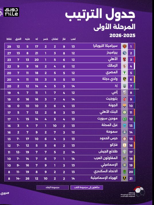 جدول ترتيب أندية الدورى المصري قبل استئناف المسابقة الأربعاء المقبل