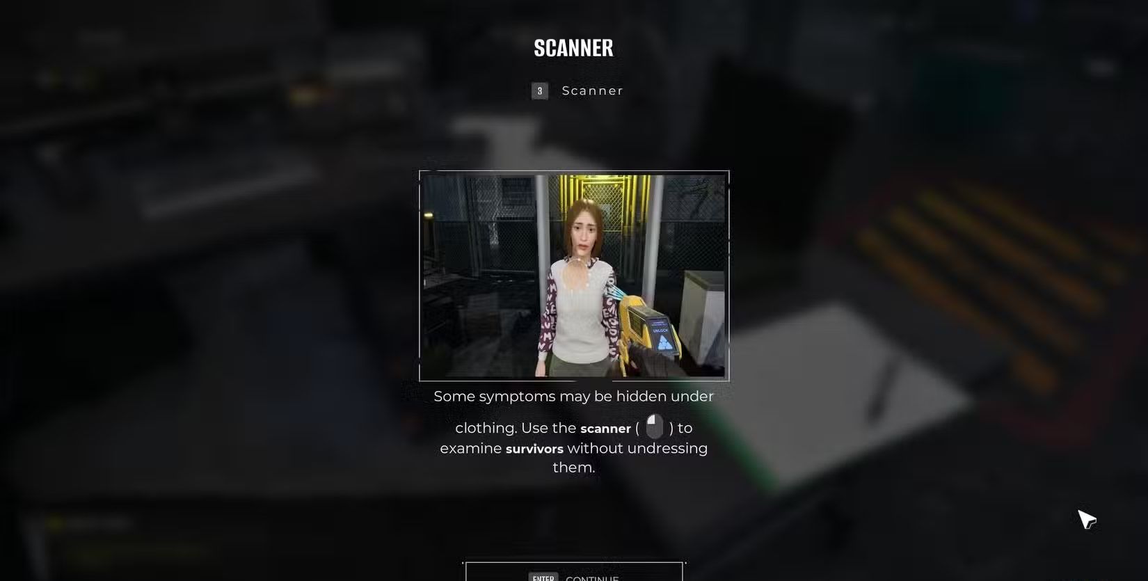 Quarantine Zone: The Last Check تستخدم أداة Scanner كوسيلة أساسية للكشف عن الأعراض الجسدية المخفية التي لا تظهر أثناء الفحص العادي خاصة العلامات التي قد تكون مغطاة بالملابس مثل آثار العض أو الجروح الصغيرة التي تدل على بداية العدوى.