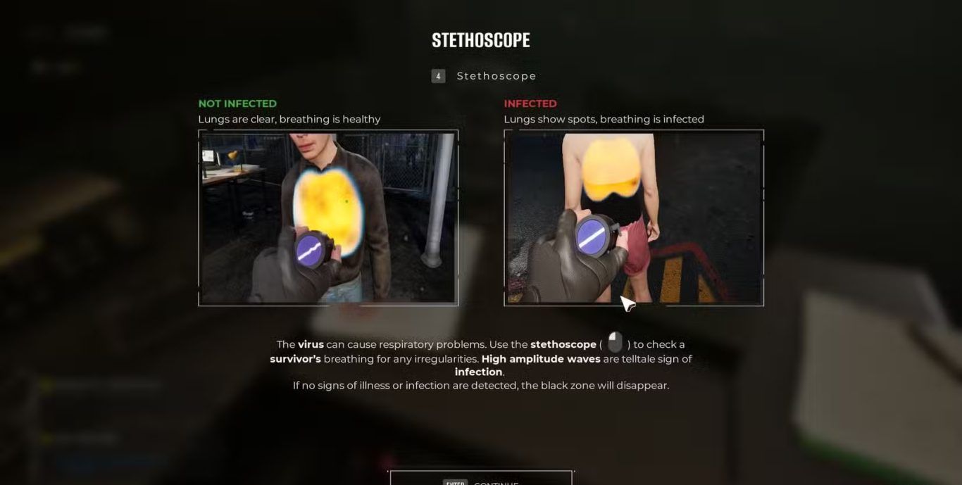 Quarantine Zone: The Last Check تستخدم أداة Stethoscope في الحالات التي يظهر فيها على الناجين صعوبة أو اضطراب في التنفس حيث تعد هذه الأداة أساسية للكشف عن مؤشرات العدوى التي تؤثر بشكل مباشر على الرئتين ولا يمكن تأكيدها من خلال الفحص الخارجي فقط.