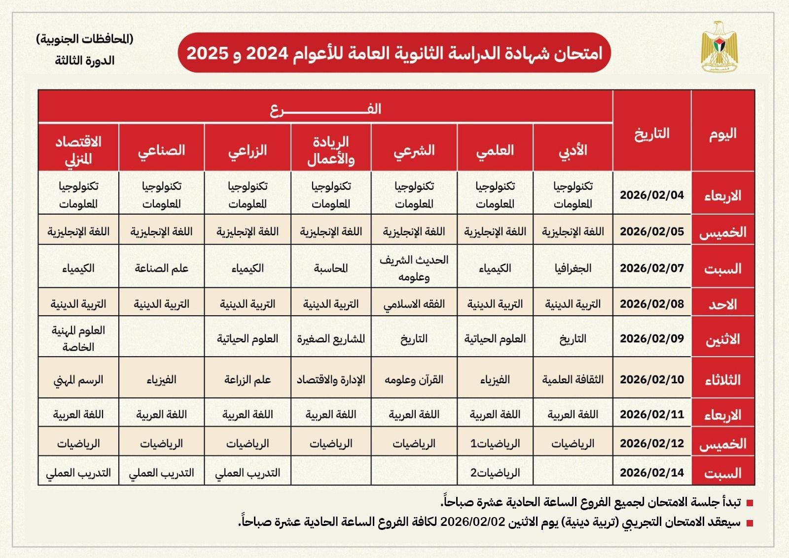 نشرت وزارة التربية والتعليم العالي، مساء اليوم الثلاثاء 20 يناير 2025، جدول امتحان الثانوية العامة "الدورة الثالثة" للعامين 2024 و2025 للطلبة داخل قطاع غزة .