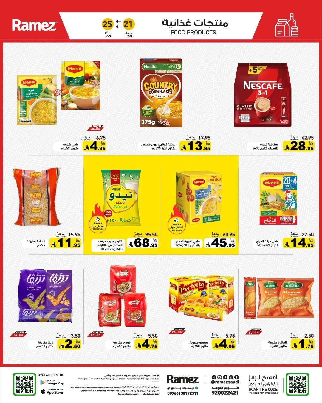 عروض أسواق رامز السعودية الأربعاء 21-1-2026 الموافق 2 شعبان 1447هـ تقدم منتجات غذائية منها جبنة شيدر ولحم مبرد ومخبوزات وزيت جوز وحلويات وشوكولاتة وقهوة وزيت زيتون وأرز فاخر وفاكهة ومأكولات بحرية ودجاج وتكتمل بأجهزة منزلية تشمل صانعة قهوة وفرن بيتزا وخلاط ومكواة بخار وشاشة ذكية وقلاية هوائية ومحضرة طعام ومكنسة