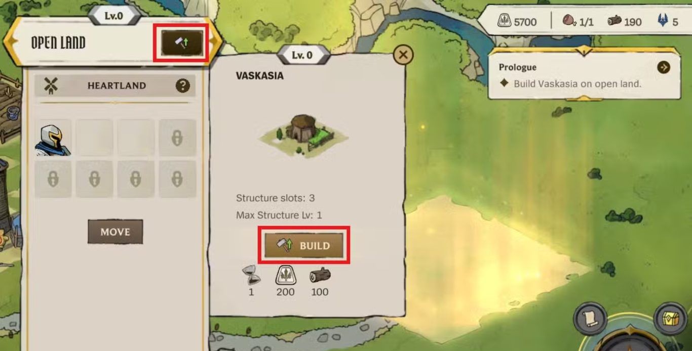 يجب على اللاعب النقر على مساحة Open Land التي تظهر بعد زوال الإقليم المعادي وعند فتحها سيلاحظ في الجزء العلوي من الواجهة زر يحمل رمز المطرقة مع سهم أخضر وهو الخيار المسؤول عن فتح قائمة البناء الخاصة بالمستوطنة الجديدة.