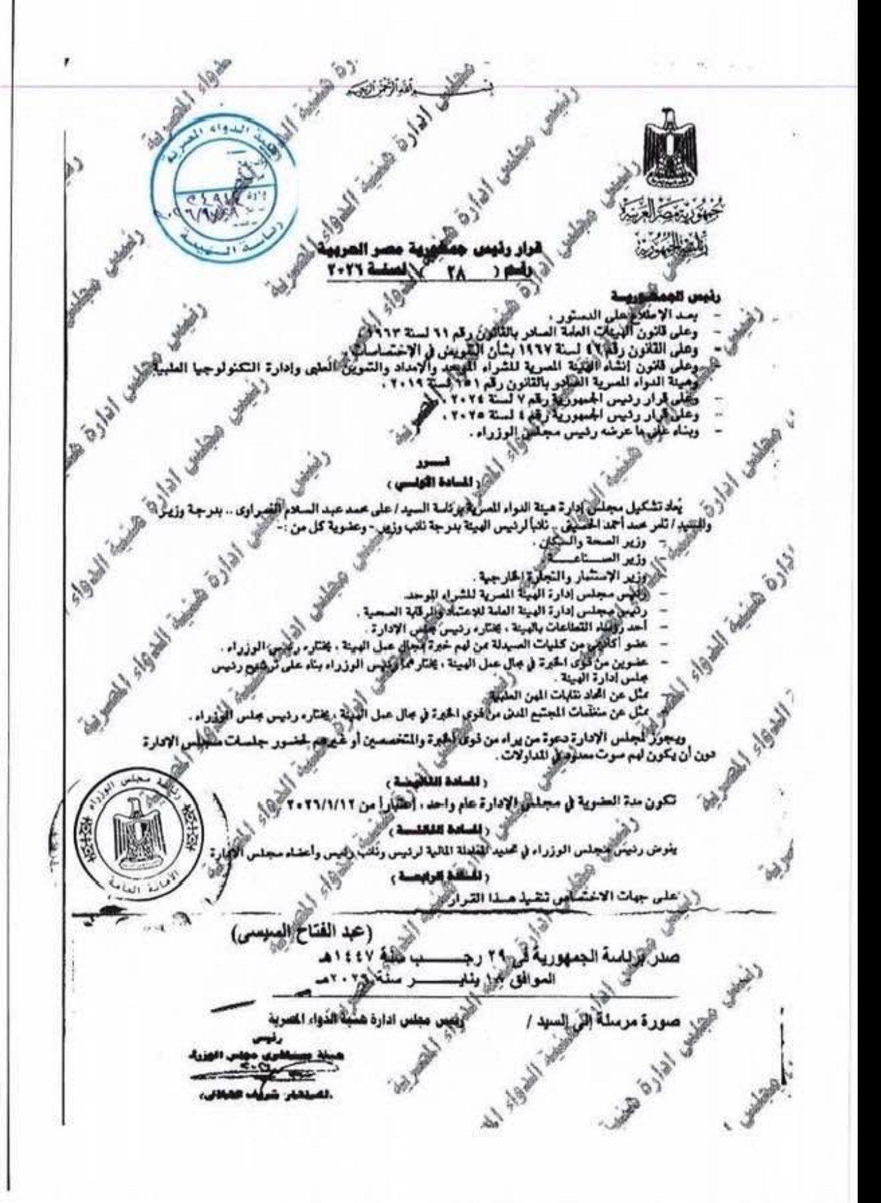 الأربعاء، 21 يناير 2026 06:16 مأصدر الرئيس عبد الفتاح السيسى رئيس الجمهورية القرار رقم 28 لسنة 2026، بتشكيل مجلس إدارة هيئة الدواء المصرية ، برئاسة الدكتور على الغمراوى بدرجة وزير، والدكتور تامر الحسينى نائبا لرئيس الهيئة بدرجة نائب وزير.