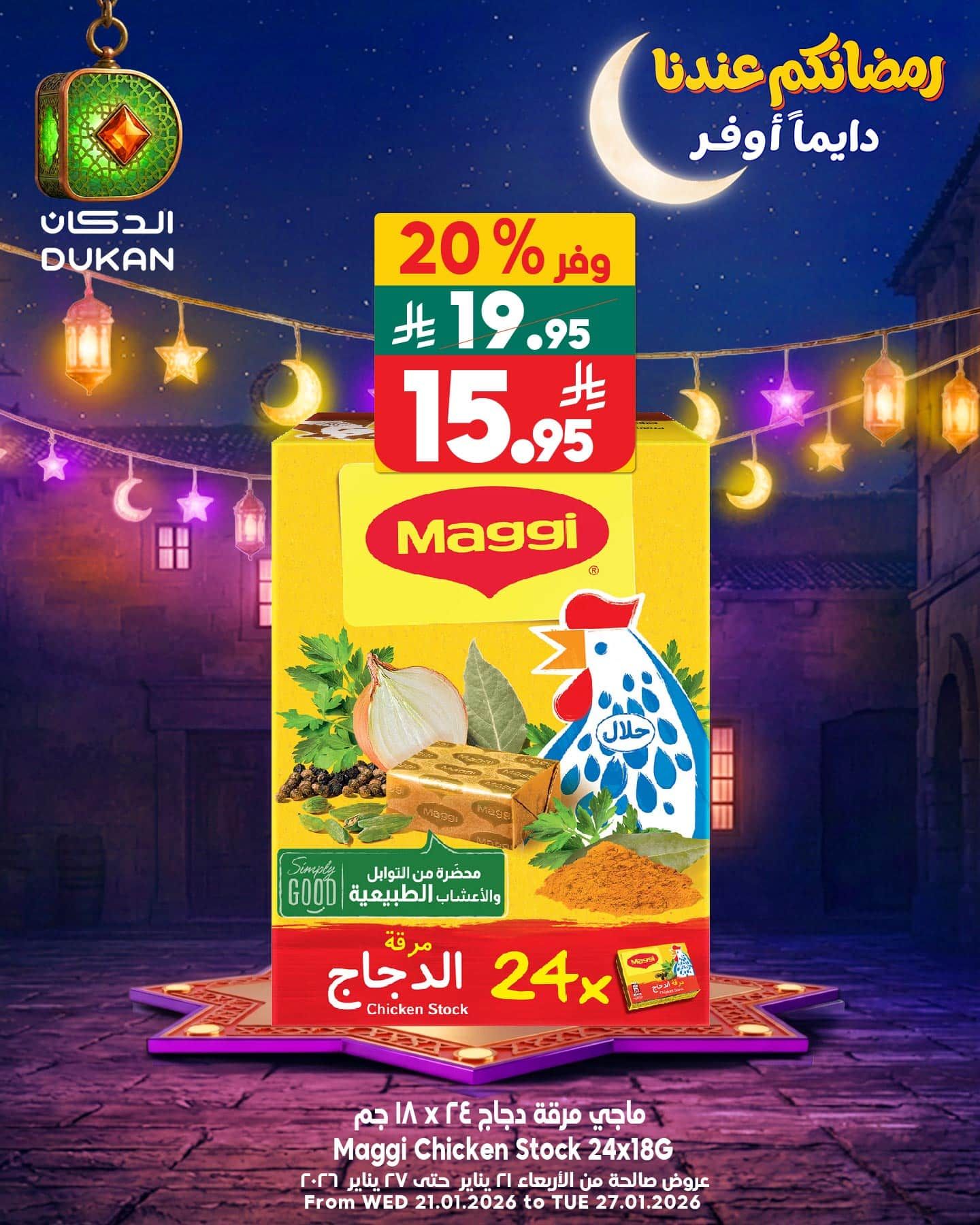 بنقدم ليكم عروض الدكان جدة الخميس 3 شعبان 1447هـ الموافق 22 يناير 2026 و تحتوي علي خصومات رمضانية على مرق الدجاج ماجي وأرز بسمتي ليجند كلاسيك ومنظف أريال بيسك مستورد و بيوفر كمان عصير القطنف والخلطات والتونغ والستايل ريس والعسل والشوفان كويكر وغيرها من المنتجات باسعار مميزة
