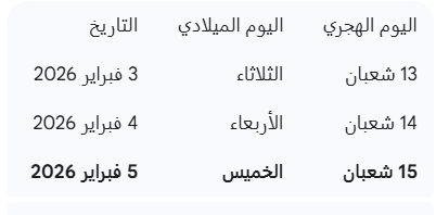 تاريخ ليلة النصف من شعبان 2026 بالمغرب: تبدأ من مغرب يوم الأربعاء 14 شعبان 1447هـ الموافق لـ 4 فبراير 2026.