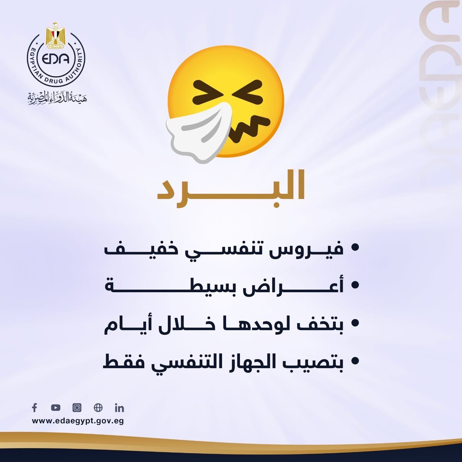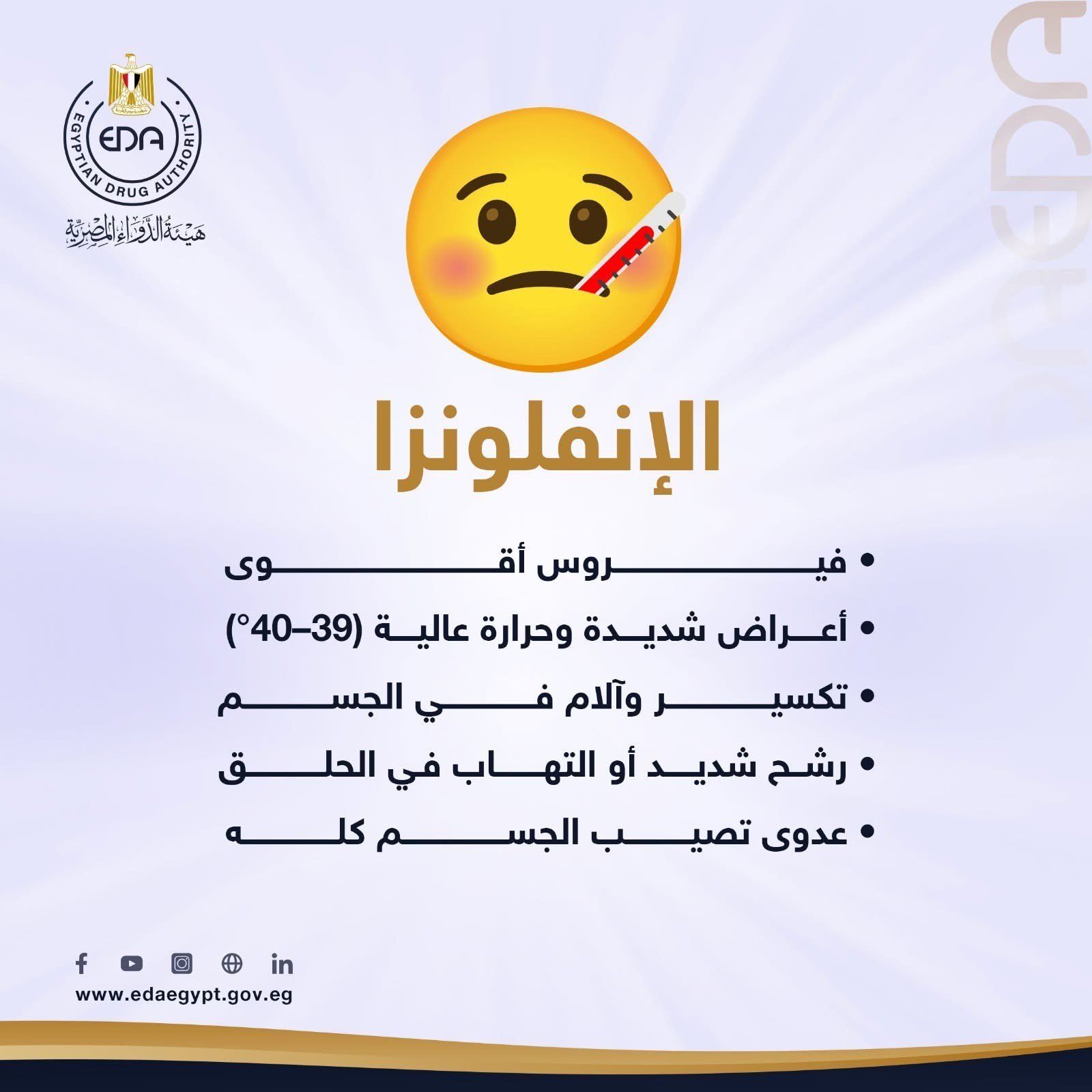 وأشارت هيئة الدواء إلى أن الإنفلونزا ليها 3 أنواع رئيسيين وهو فيروس يحارب الجسم بأكمله وله عددا من الأعراض تتمثل في ارتفاع في درجات الحرارة وتصل لـ39° مع تكسير شديد وصداع.