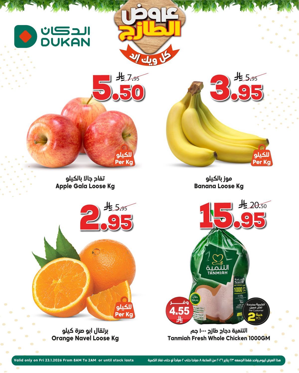عروض اسواق الدكان ليوم الجمعه 23 يناير 2026 عرض الجمعه المجنون العرض ليوم واحد فقط الجمعه 23 يناير 2026 من الساعة 6 صباحاً أو لحين تنفد الكمية أسعار مجنونة ليوم واحد استفيدوا من افضل العروض الطازج و الواد الغذائية في جميع الفروع ضمن اسواق الدكان.