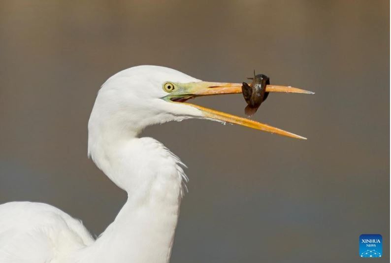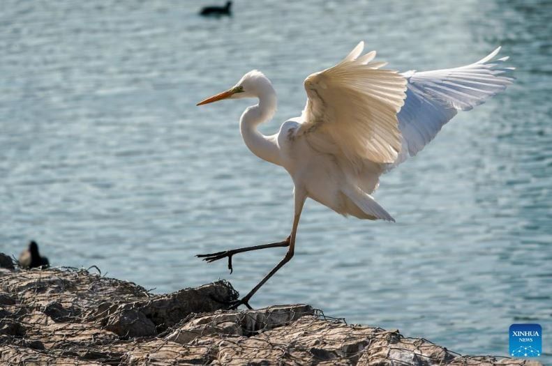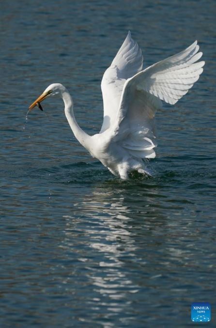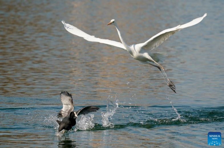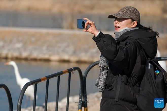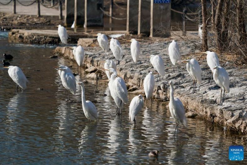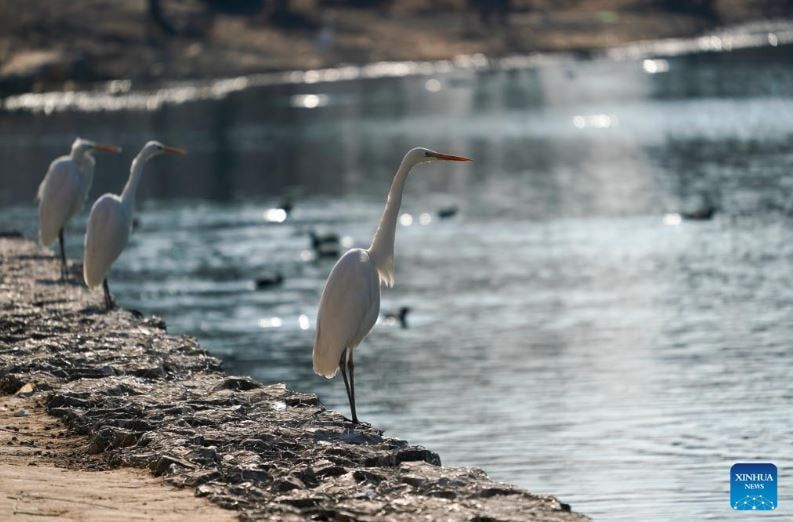 رصدت الصور طائر بلشون أبيض يبحث عن طعامه في متنزه للأراضي الرطبة في تاييوان، بمقاطعة شانشي شمال الصين وقد اختارت أعداد متزايدة من الطيور المهاجرة حوض نهر فينخه للراحة وقضاء فصل الشتاء فيه، وذلك بفضل التحسينات المستمرة في البيئة الإيكولوجية خلال السنوات الأخير