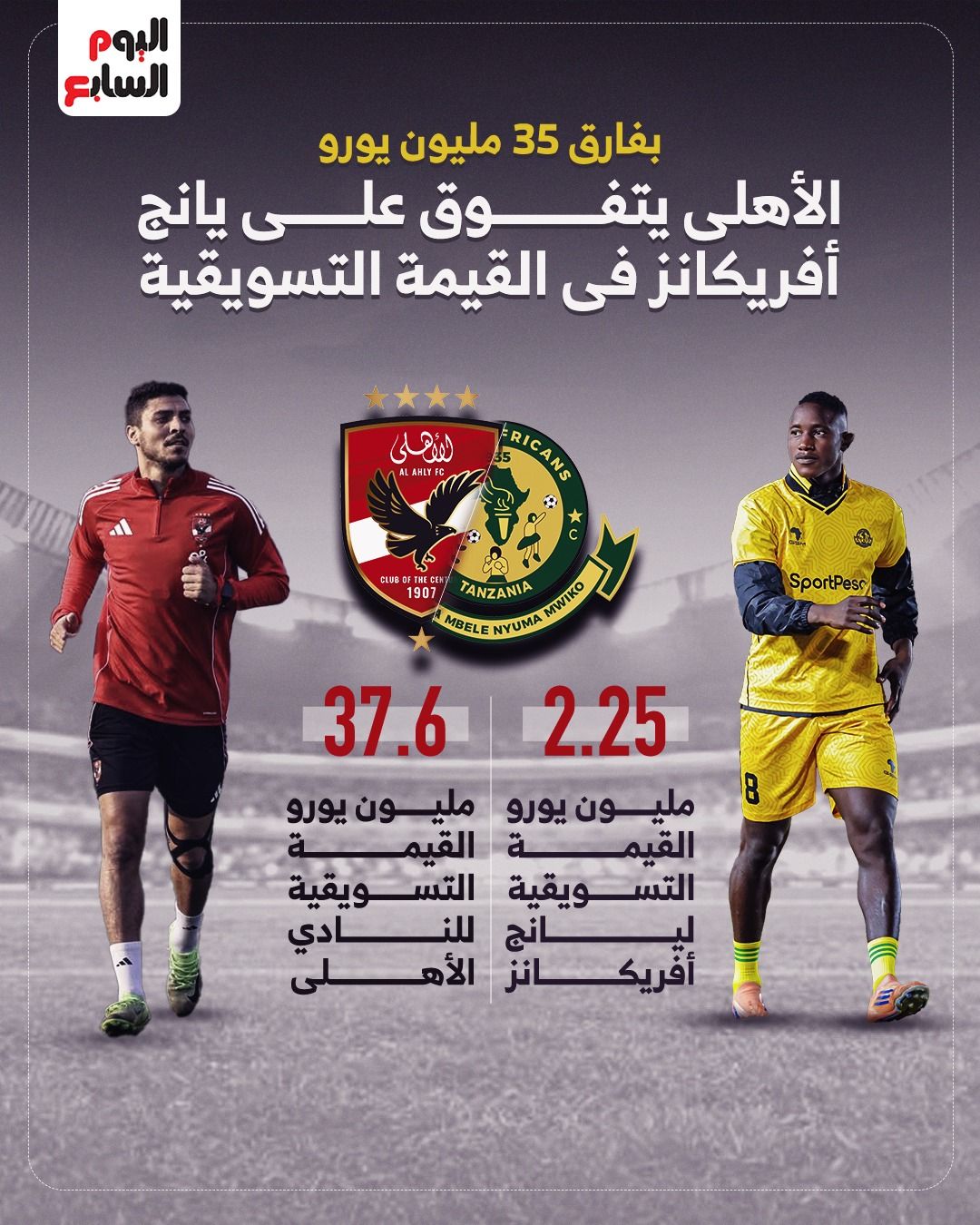 القيمة التسويقية للفريقينتبلغ القيمة التسويقية للأهلى 37.60 مليون يورو فيما تبلغ القيمة التسويقية ليانج أفريكانز 2.25 مليون يورو.