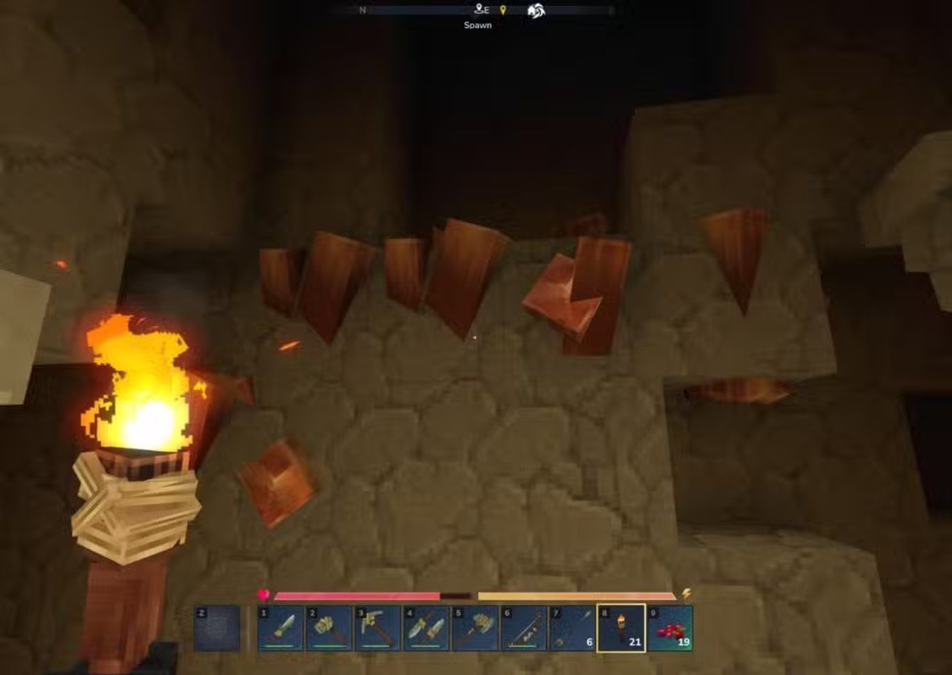 يظهر Copper Ore داخل اللعبة على هيئة أعمدة بلون يميل إلى الصدأ تخرج من bedrock مع وجود تدرج لوني أبيض واضح قرب الأجزاء العلوية من الخام مما يساعد اللاعب على تمييزه بسهولة أثناء الاستكشاف داخل الكهوف والأنفاق.