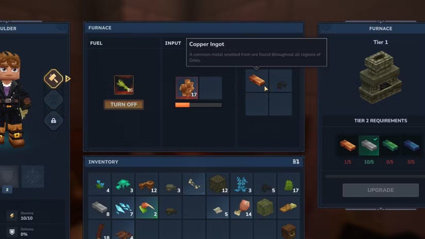 عند اكتمال الإعداد يقوم اللاعب بتفعيل Furnace من خلال اختيار Turn On لتبدأ عملية الصهر ويظهر شريط تقدم أسفل Copper Ore يعكس مراحل التحويل من الخام إلى Ingot ويمنح اللاعب مؤشرا واضحا على الوقت المتبقي لإتمام العملية.