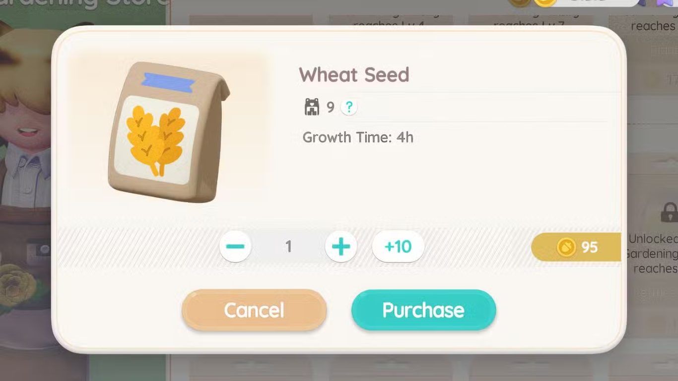 تبلغ تكلفة كل Wheat Seed مبلغ 95 Gold ويتطلب شراؤها توفر Gardening Level 2 وهو ما يجعل التخطيط المالي جزءا مهما من عملية التوسع الزراعي خاصة عند الرغبة في زراعة كميات كبيرة بشكل منتظم.
