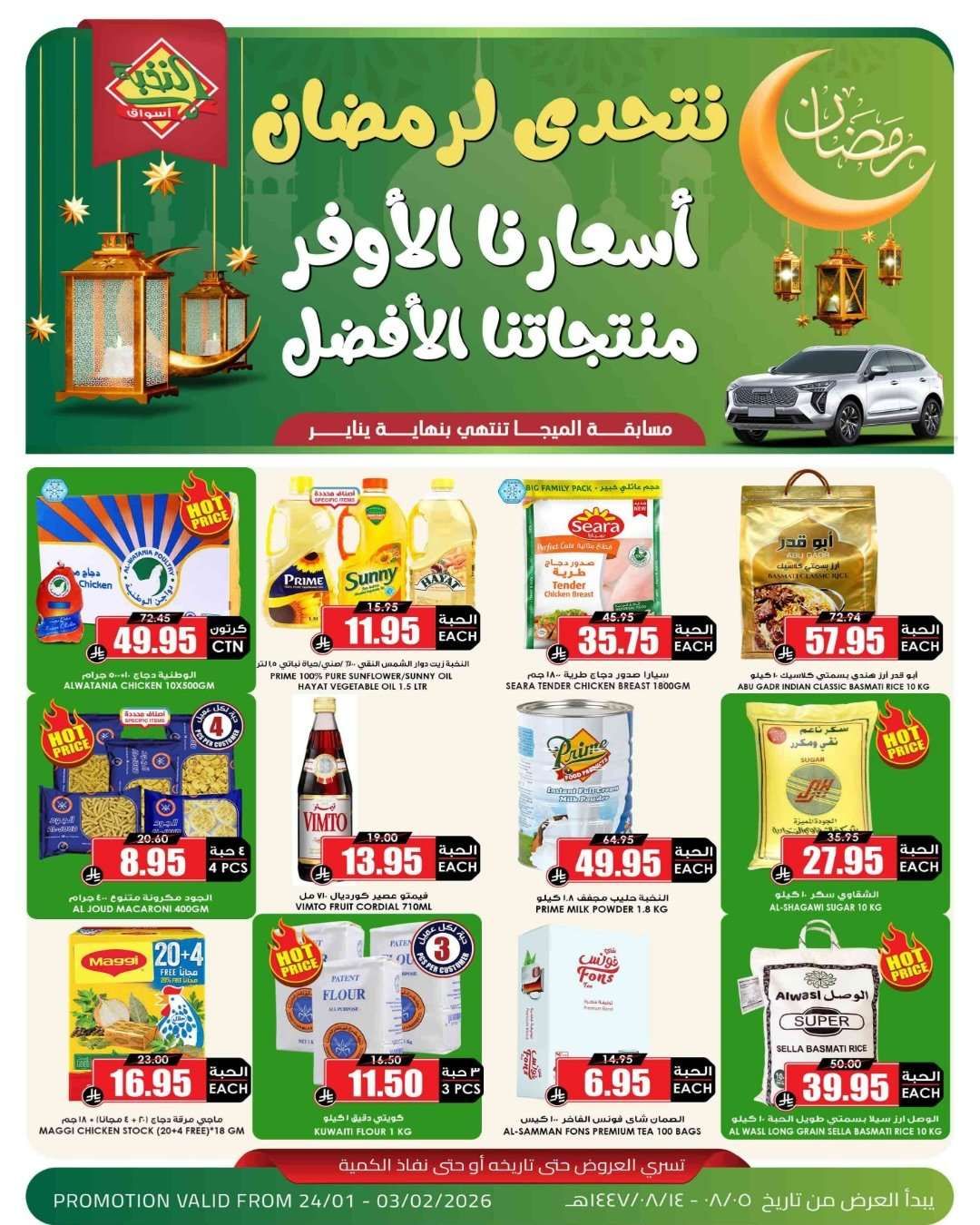 اسواق النخبة الاسبوعية السبت 5-8-1447هـ الموافق 24 يناير 2026 و تحتوي علي تشكيلة كبيرة من المنجات الغذائية و الخضروات و الفواكه الطازجة و بمناسبة هر الكريم بتقدم تشكيلة من المنتجات الاستهلاكية و الارز و الزيوت و التوابل و اللحوم و منتجات كتيرة باسعار مميزة في عروض و رمضان 1447هـ