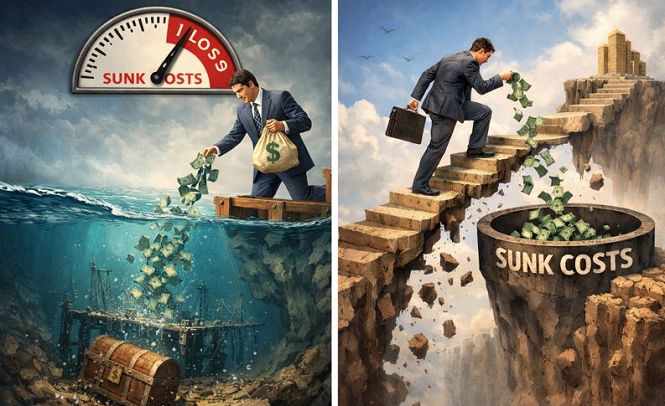 غالباً ما تتردد الشركات في إيقاف مشروع فاشل، خوفاً من أن يُعد ذلك “هدرًا للموارد”. وهذا ما يُعرف بـ انحياز التكلفة الغارقة أو مغالطة التكلفة الغارقة، وهي التي تدفع المؤسسات إلى استمرار الإنفاق رغم عدم جدواه.