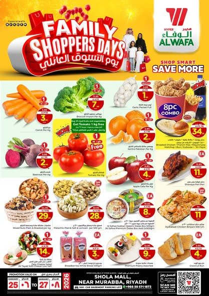 عروض الوفاء هايبر ماركت الاحد 25-7-1447هـ الموافق 6 شعبان 1447هـ و تحتوي علي البطاطس والجزر والبروكولي والطماطم والبرتقال والتفاح والموز والمكسرات والسمك والدجاج واللحم البقري والغنمي إضافة إلى الأرز والحليب والزبادي والعصائر والتوابل و باسعار مميزة و لفترة محدودة ابقوا معنا ليصلكم كل جديد عن عروض السعودية .