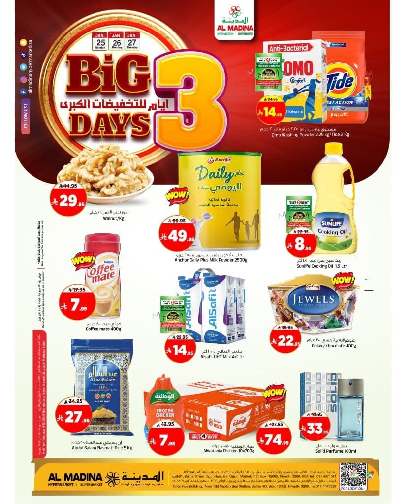 عروض المدينة هايبر ماركت 3 ايام فقط 25 يناير 2026 اقوى العروض الخاصة لبداية الاسبوع في اسواق المدينة المنتشر في جميع انحاء المملكة العربية السعودية و التي يقدم فيها تخفيضات مميزه على الخضار و الفواكه و اللحوم ومقاضي المنزل الاساسيه من 25 حتى 27 يناير 2026 فقط