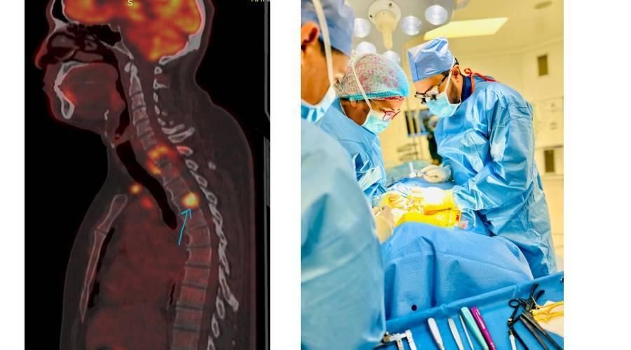 وكشفت الفحوص السريرية وصور الأشعة الدقيقة، وجود أورام منتشرة في مناطق عدة بالجسد، تركزت أخطرها في الفقرتين العنقية السابعة والصدرية الأولى، ما شكل ضغطاً مباشراً على النخاع الشوكي، هدد المريض بفقدان القدرة على الحركة.