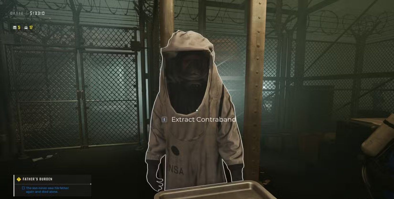 يتعين على اللاعب التوجه إلى الرجل الذي يرتدي بدلة hazmat بيضاء ويحمل صينية مخصصة للتعامل مع العناصر المصادرة حيث تم تصميم هذا الدور خصيصا للتعامل مع الحالات الحساسة التي تتطلب عزلا كاملا ومنعا لأي تلامس مباشر.