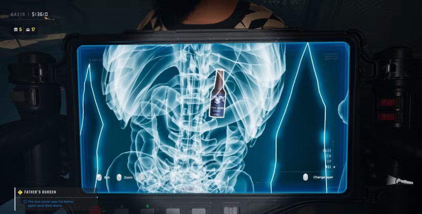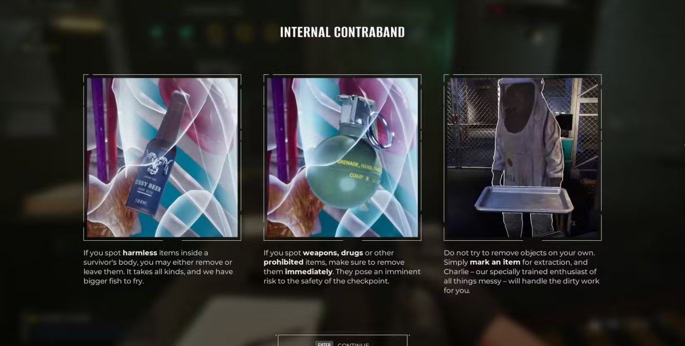 عند ملاحظة أي جسم غريب أثناء الفحص باستخدام أداة X Ray يجب على اللاعب تحديده مباشرة ليتم تمييزه بصريا بشكل واضح مما يسهل تتبعه واتخاذ القرار المناسب بشأن مصير الناجي دون .