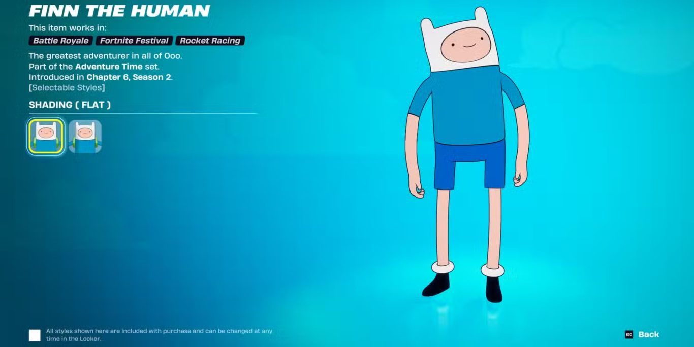 يمكن الحصول على زي Finn the Human مباشرة من متجر Fortnite مقابل 1500 V Bucks وهو السعر القياسي لمعظم شخصيات التعاون مع Adventure Time داخل اللعبة.