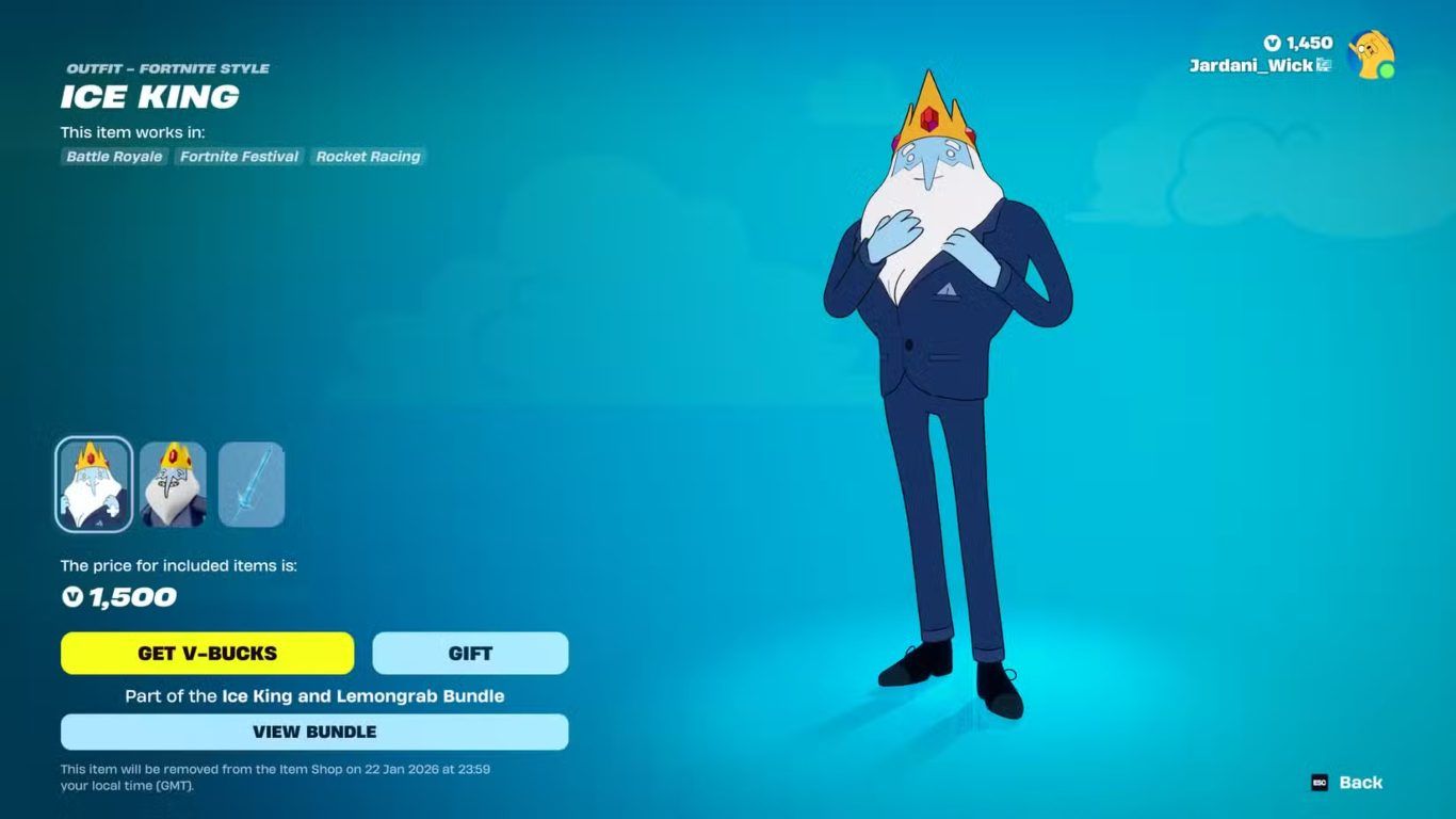 تعد شخصية Ice King من الشخصيات الشهيرة القادمة من عالم Adventure Time داخل لعبة Fortnite حيث يمكن للاعبين الحصول على هذا الزي مباشرة من المتجر مقابل 1500 V Bucks.