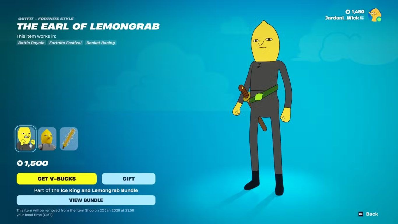 يتم تقديم Lemongrab داخل Fortnite كزي مستقل يمكن الحصول عليه من المتجر مقابل 1500 V Bucks ويمنح اللاعبين فرصة استخدام شخصية ذات حضور قوي ومظهر أيقوني داخل أوضاع اللعب المختلفة.