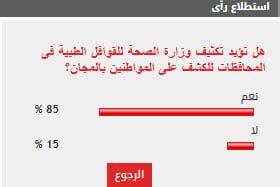وأيد 85% من القراء مطالب تكثيف وزارة الصحة للقوافل الطبية فى المحافظات للكشف على المواطنين بالمجان، بينما عارض 15% من القراء مطالب تكثيف وزارة الصحة للقوافل الطبية فى المحافظات للكشف على المواطنين بالمجان.