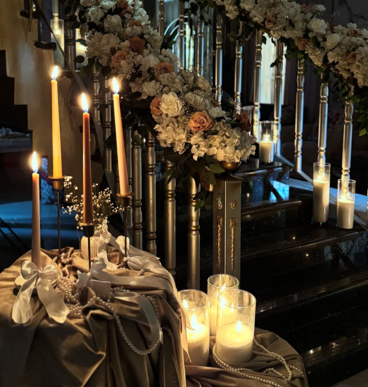 - حاملات الشموع: تعكس حاملات الشموع في حفل الزفاف والمرصّعة باللؤلؤ، الضوء بشكل رائع، ويمكن تنسيقها مع شمعدانات كريستالية لمضاعفة التأثير الرومانسـي.