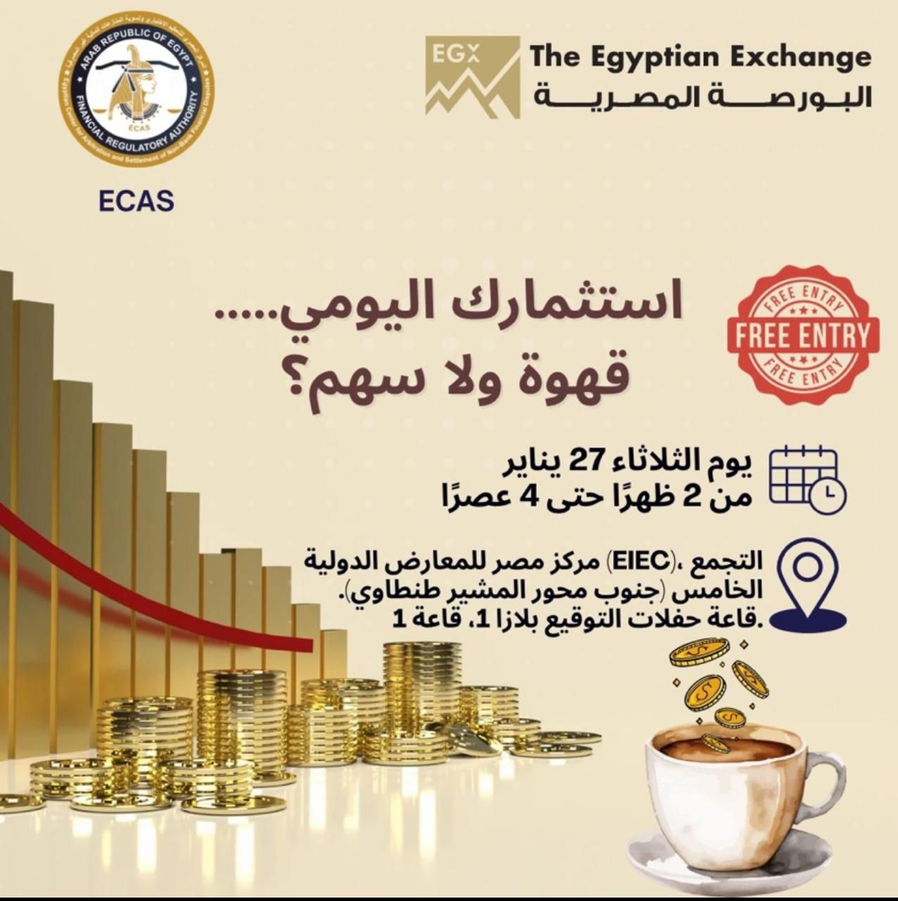 الأحد، 25 يناير 2026 11:24 صينظم المركز المصري للتحكيم وتسوية المنازعات المالية وغير المصرفية (ECAS)، بالتعاون مع البورصة المصرية (EGX)، ندوة توعوية بعنوان "استثمارك اليومي… قهوة ولا سهم؟"، تحت شعار "انت نتيجة اختياراتك"، وذلك يوم الثلاثاء المقبل 27 يناير 2026، من الساعة 2:00 إلى 4:00 عصرًا، بمقر مركز مصر للمعارض الدولية (EIEC)، قاعة حفلات التوقيع، ويكون الحضور مجانًا، وإتاحة هذا الرابط للتسجيل: https://lnkd.in/dgzCsMTA