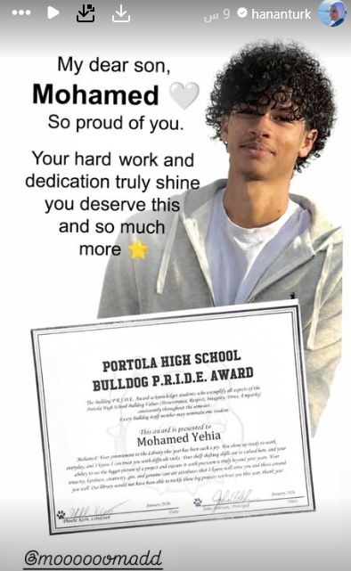 احتفلت الفنانة حنان ترك، بتكريم ابنها محمد وتميزه بين الطلاب، ونشرت حنان ترك، عبر ستوري إنستجرام، صورة شهادة التقدير لـ ابنها محمد، وعلقت: ابني العزيز محمد، فخورة بك جدًا، أنت تستحق هذا وأكثر بكثير .
