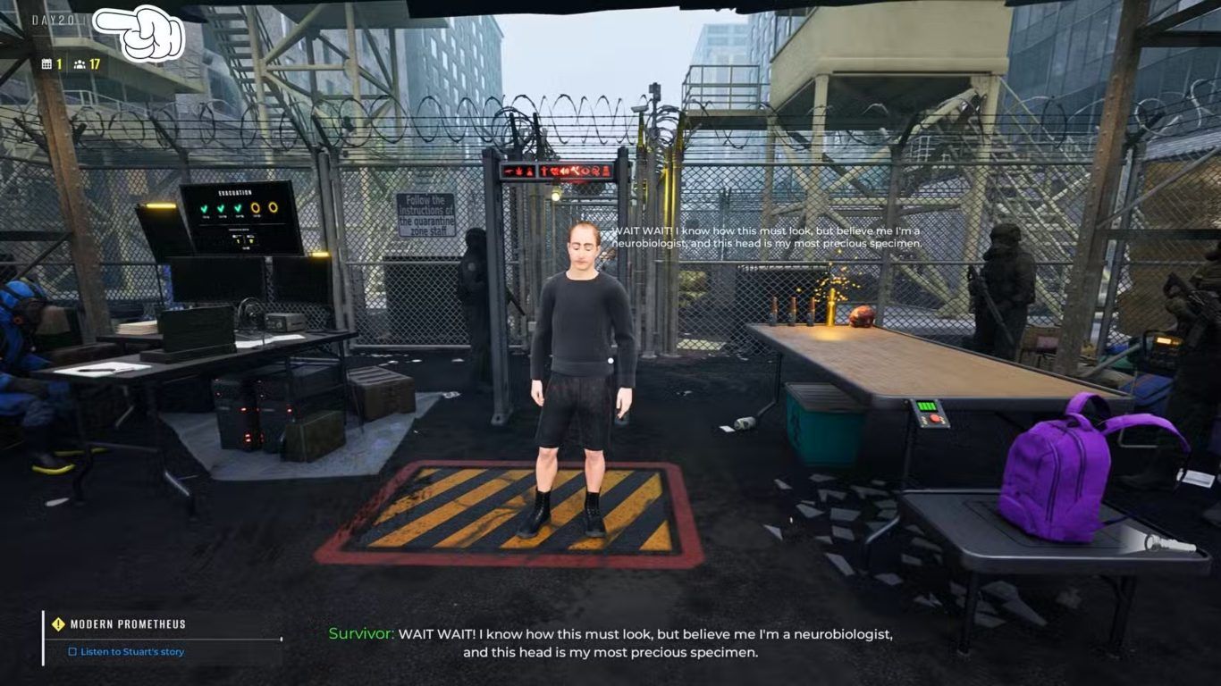 عند التحدث مع Stuart يشرح لللاعب سبب حمله لجزء من جسد زومبي داخل حقيبته ويوضح أن هذا الجزء يمثل عينة أساسية لتجربة علمية يحاول إكمالها لفهم أعمق لطبيعة التحول والعدوى داخل عالم Quarantine Zone The Last Check.