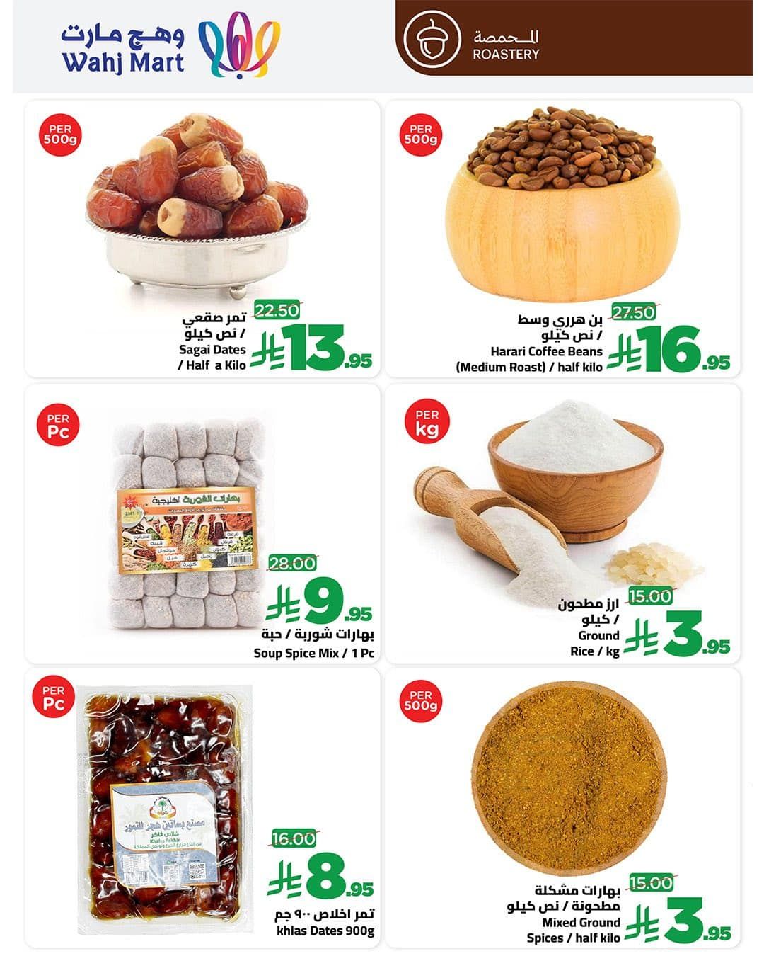 عروض وهج مارت جدة الاثنين 26 يناير 2026 الموافق 7 شعبان 1447هـ و تحتوي علي تمر صقعي وتمر إخلاص بالإضافة إلى الأرز المطحون والبهارات المشكلة وبهارات الشوربة بالاضافة الي خضروات متنوعة منها الباذنجان الأسود والبطاطس والبصل والفاصوليا الخضراء والبنجر والثوم وطماطم الشوكي مع تشكيلة من اللحوم الفريش