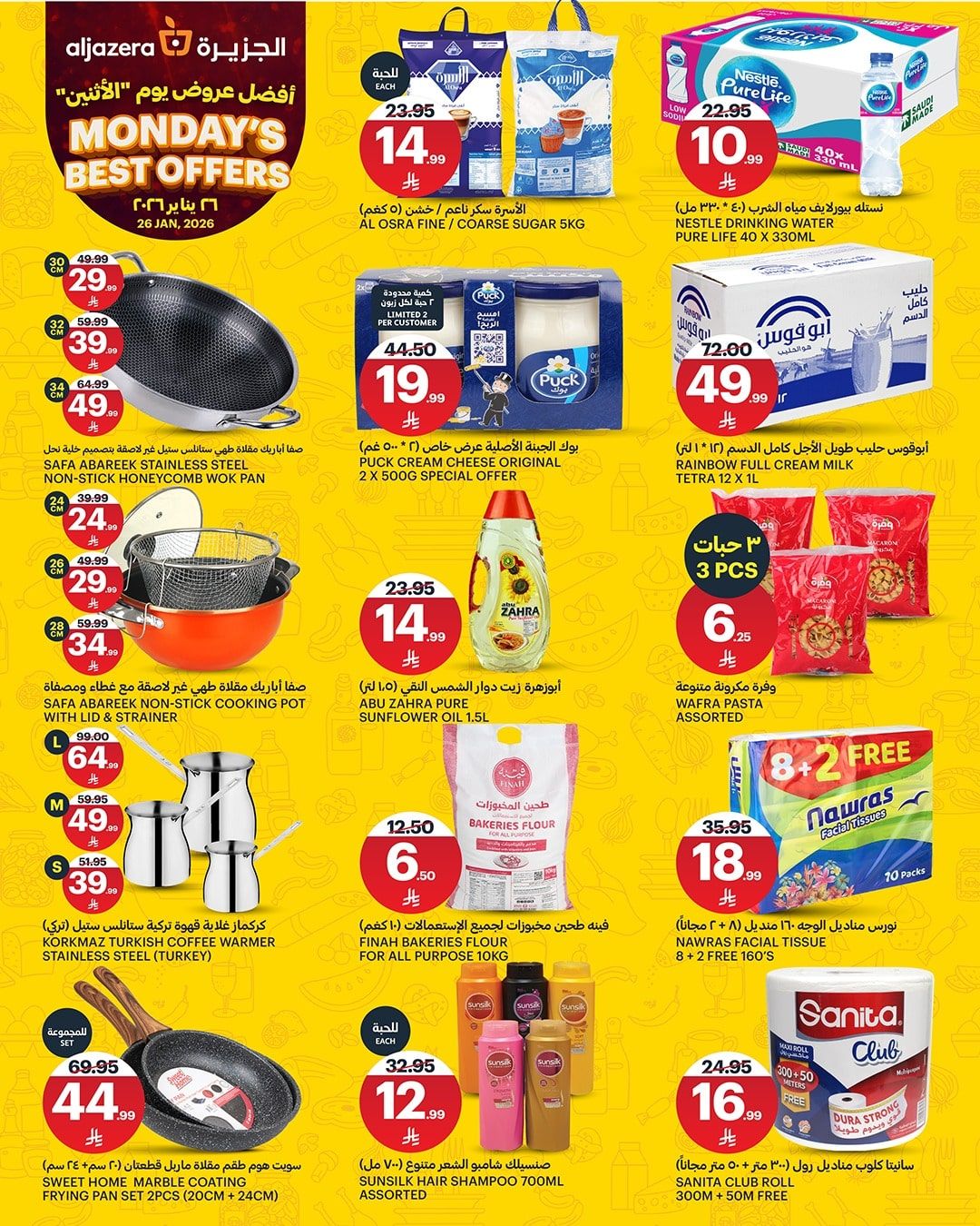 بنقدم ليكم احدث اسواق الجزيرة الاثنين 26-1-2026 الموافق 7 شعبان 1447هـ و تحتوي علي تشكيلة من افضل المنتجات الغذائية و الاستهلاكية و ايضا اللحوم الطازجة و الخضروات و الفواكه الفريش و غيرها من المنتجات و الاصناف و باسعار رائعة في عرض حصري متاح اليوم فقط