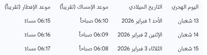 للباحثين عن موعد صيام الأيام البيض من شهر شعبان 2026 بالمغرب، إليكم الجدول التقديري لمواعيد الإمساك والإفطار (حسب توقيت الرباط والدار البيضاء):