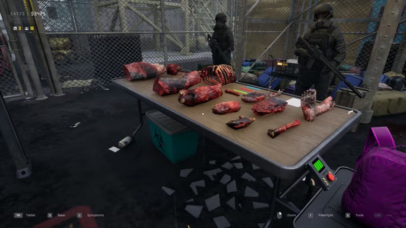 عند العثور على أي جزء من أجزاء الزومبي داخل حقيبة أحد الناجين يجب مصادرته فورا حيث يتم فرض غرامة مالية بقيمة مئة دولار عن كل جزء تتم مصادرته وهو ما يفرض ضغطا اقتصاديا إضافيا على اللاعب ويجبره على إدارة موارده المالية بحذر شديد.