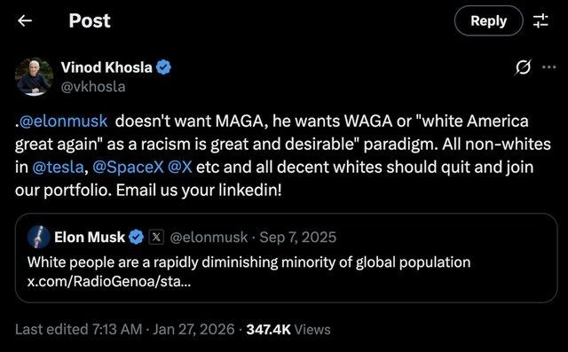 في منشور حديث على منصة X، أعاد خوسلا نشر تدوينة قديمة لماسك تعود إلى سبتمبر 2025، كتب فيها ماسك: “البيض هم أقلية تتضاءل بسرعة من سكان العالم”، واصفًا إياها بأنها تصريح مثير للجدل وعنصري.