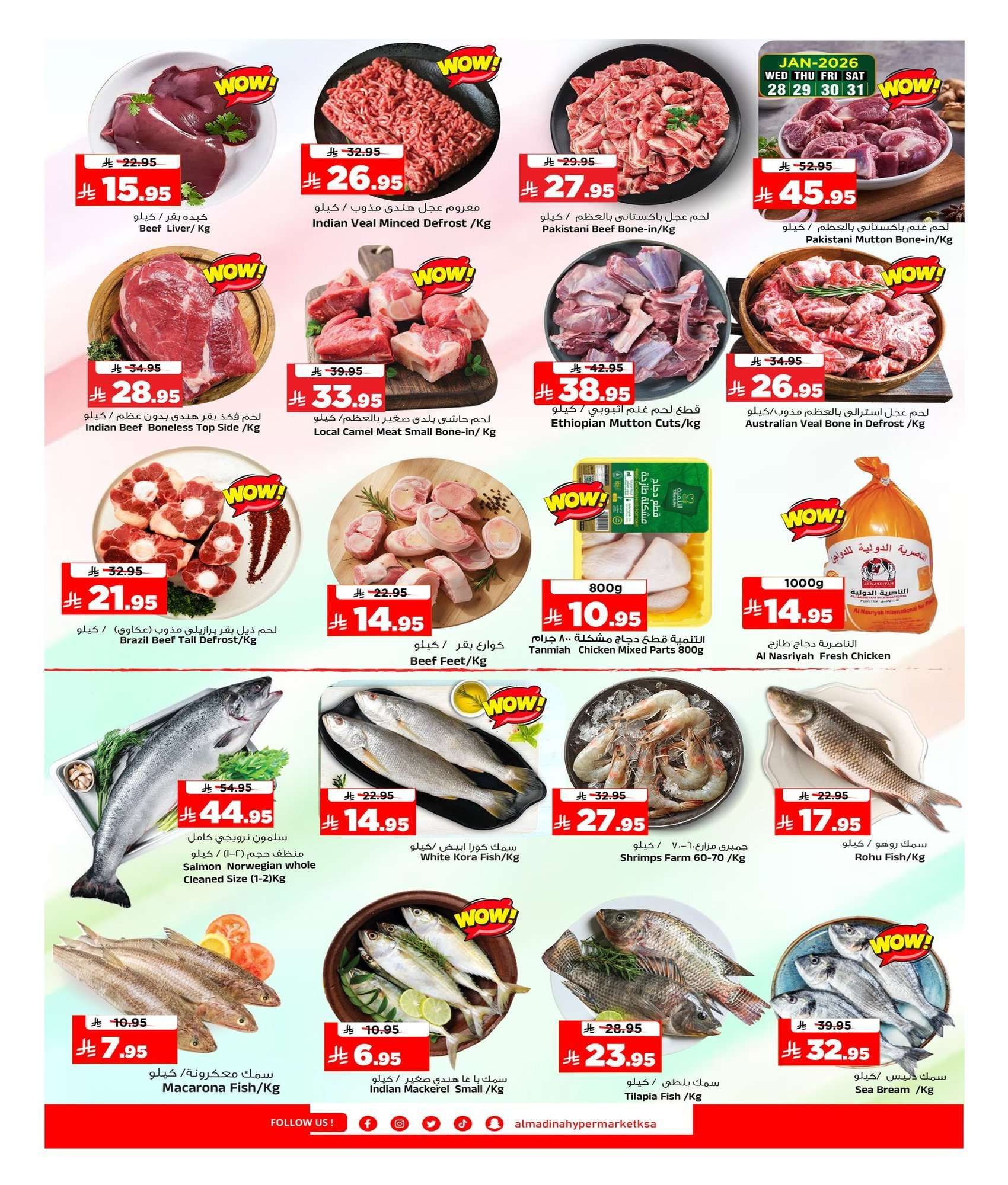 عروض المدينة هايبر ماركت الأربعاء 28 يناير 2026 الموافق 9 شعبان 1447هـ و تتضمن تشكيلة غذائية منها قطع لحم الحاشي بالعظم وسمك القاروص المبرد وزيت الكانولا النقي مع توفر الملح الصخري ودقيق الشعير والعدس كما توفر الأجهزة المنزلية منها جهاز تجفيف الفواكه ومكينة صنع الكبة ومبرد المشروبات ومكواة ومنظم الجهد الكهربائي وكشاف يدوي وقلاية زيت