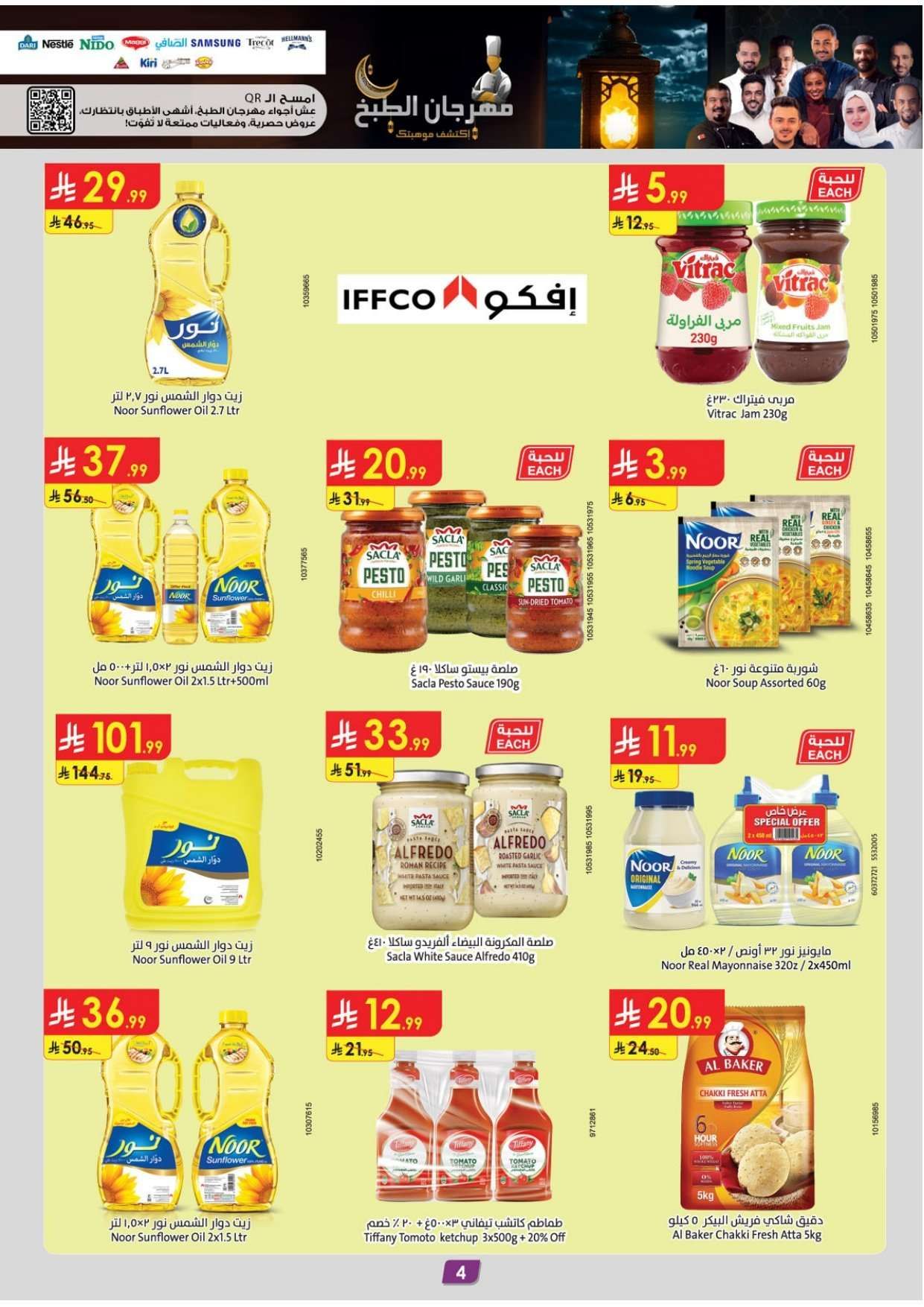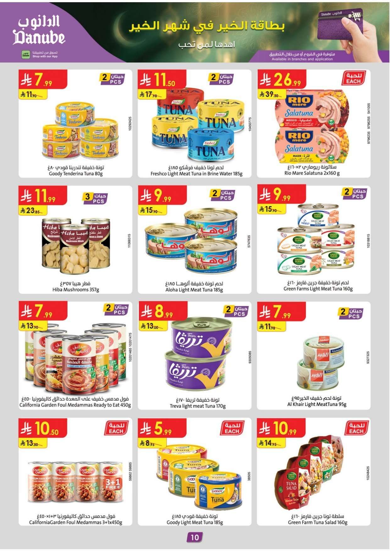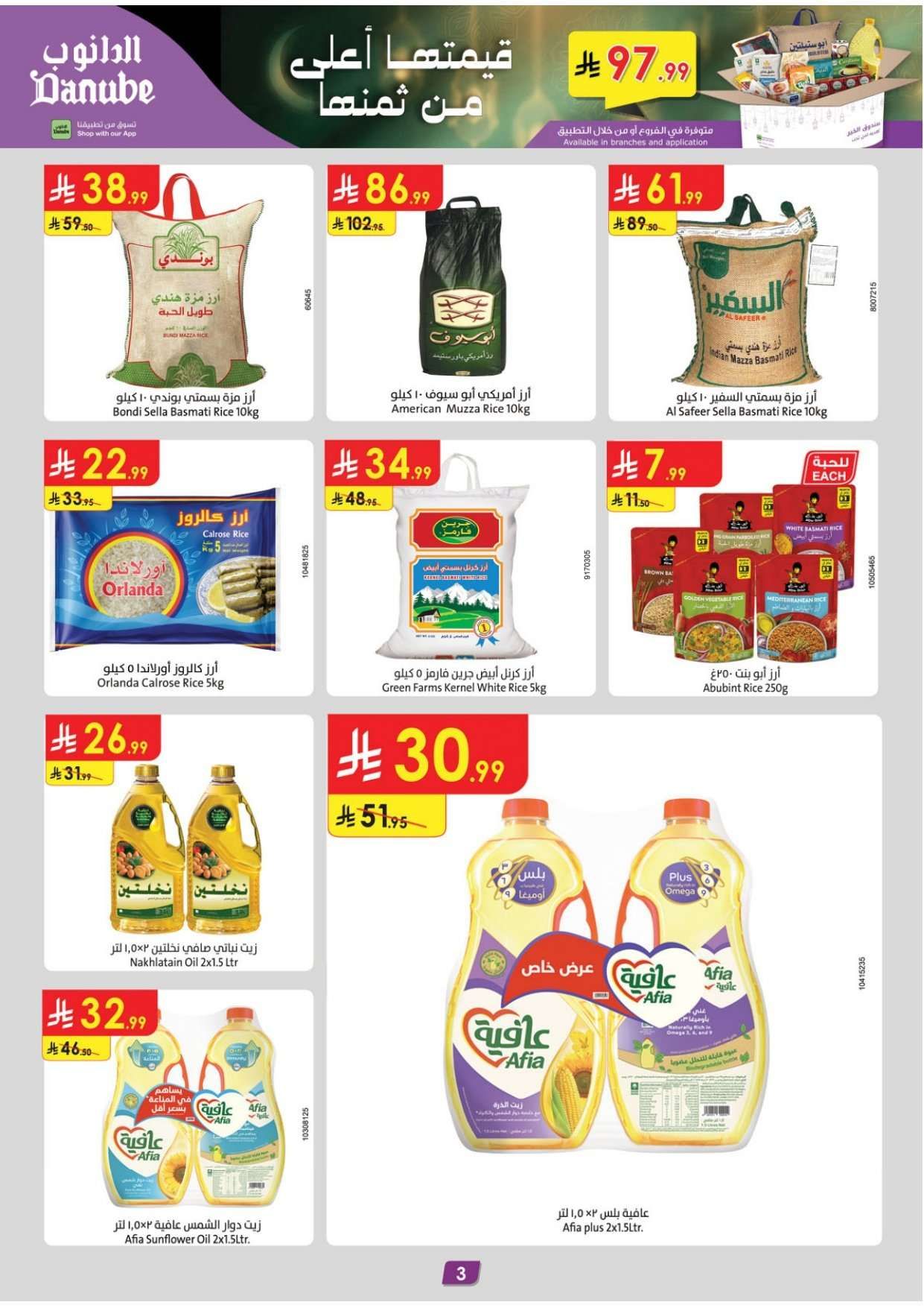 الدانوب الأسبوعية الأربعاء 28-01-2026 الموافق 9 شعبان 1447هـ و تحتوي علي تشكيلة غذائية تبدأ بقطع لحم الضأن السواكني وسمك السلمون النرويجي والجبن الشيدر المعتق وزيت الذرة النقي مع توفر التوت الأزرق وتكتمل بالأجهزة المنزلية و يضم صانعة القهوة و جهاز تبخير الأطعمة و مكينة فرم البصل و شواية الساندوتشات السريعة و مروحة تبريد