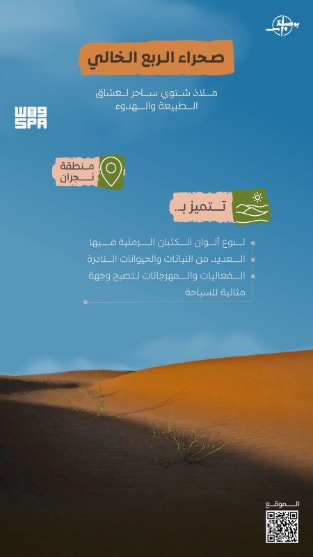 تبرز صحراء الربع الخالي، وتحديدًا في نطاق منطقة نجران، كواحدة من أهم الوجهات السياحية الشتوية في المملكة، حيث تتحول في هذا الوقت من العام إلى ملاذ ساحر يجذب عشاق الطبيعة والباحثين عن السكينة بعيداً عن صخب المدن.