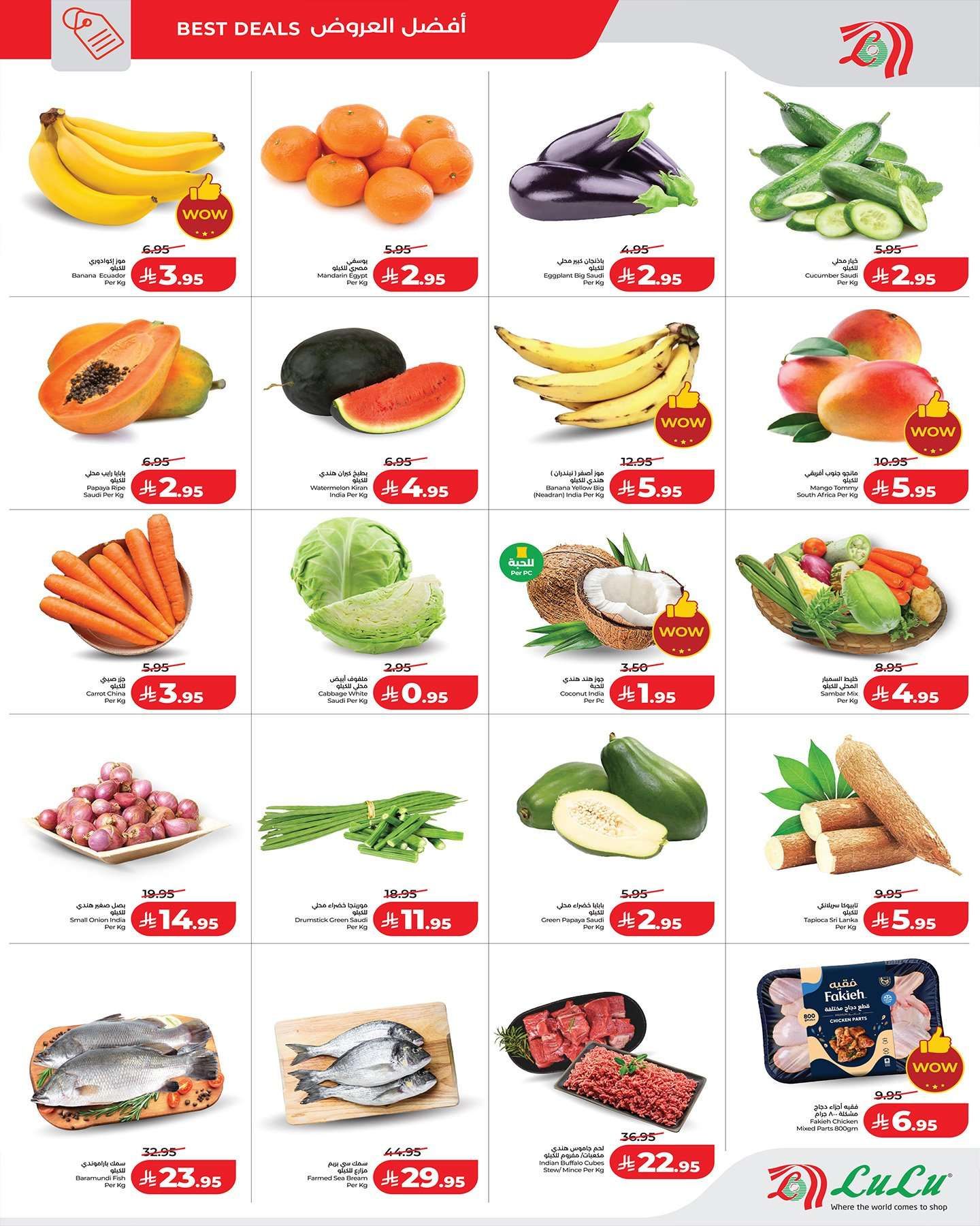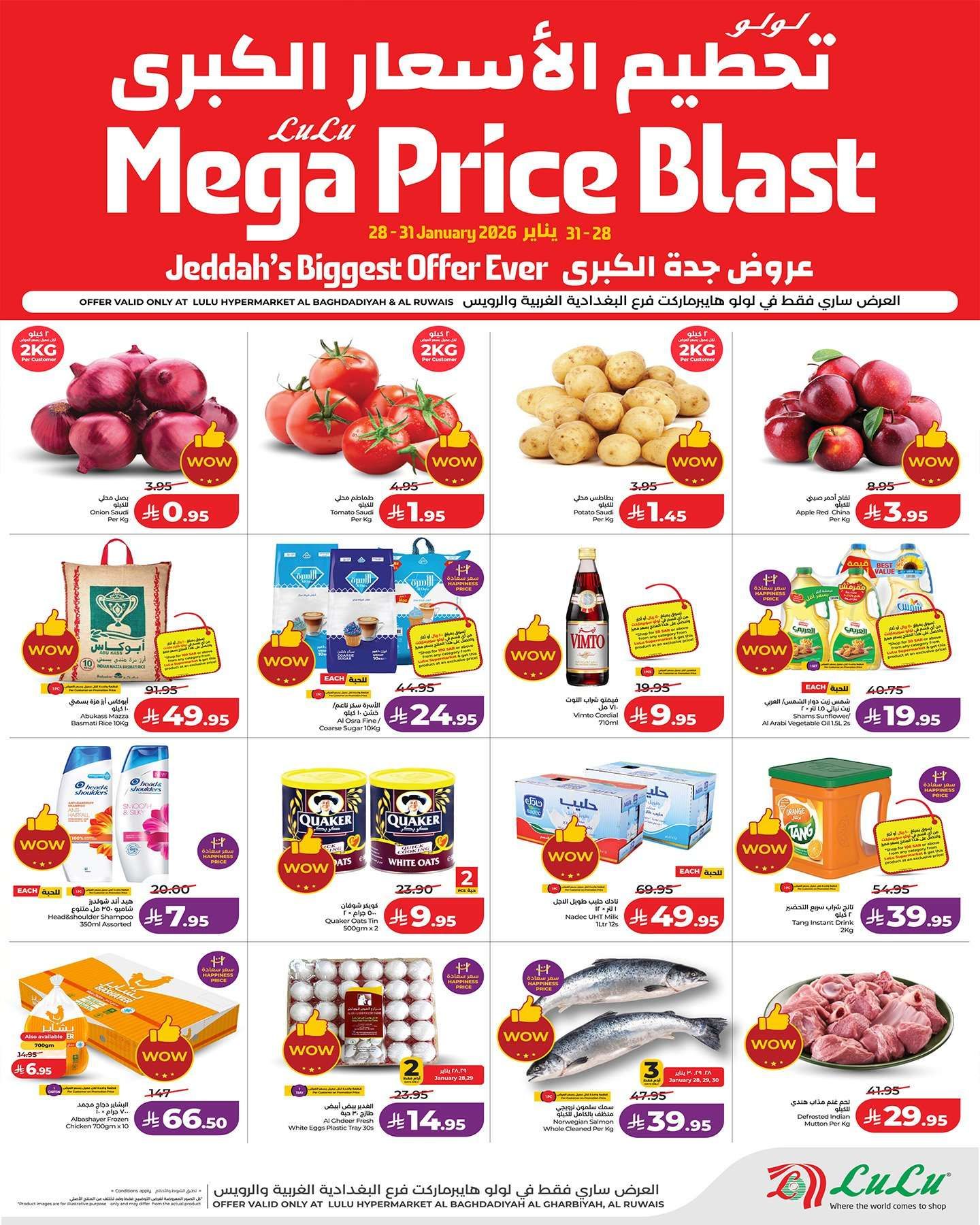 عروض لولو جدة الاسبوعية الاربعاء 28 يناير 2026 الموافق 9 شعبان 1447هـ و تشمل علي الخضروات مثل البصل والبطاطس والطماطم والفواكه كالتفاح والمانجو والموز والبابايا بالإضافة إلى السلع الأساسية مثل أرز أبو كاس وسكر الأسرة وزيت شمس وحليب نادك وشوفان كويكر وفيمتو شراب التوت كما تضم العروض اللحوم والدواجن والأسماك