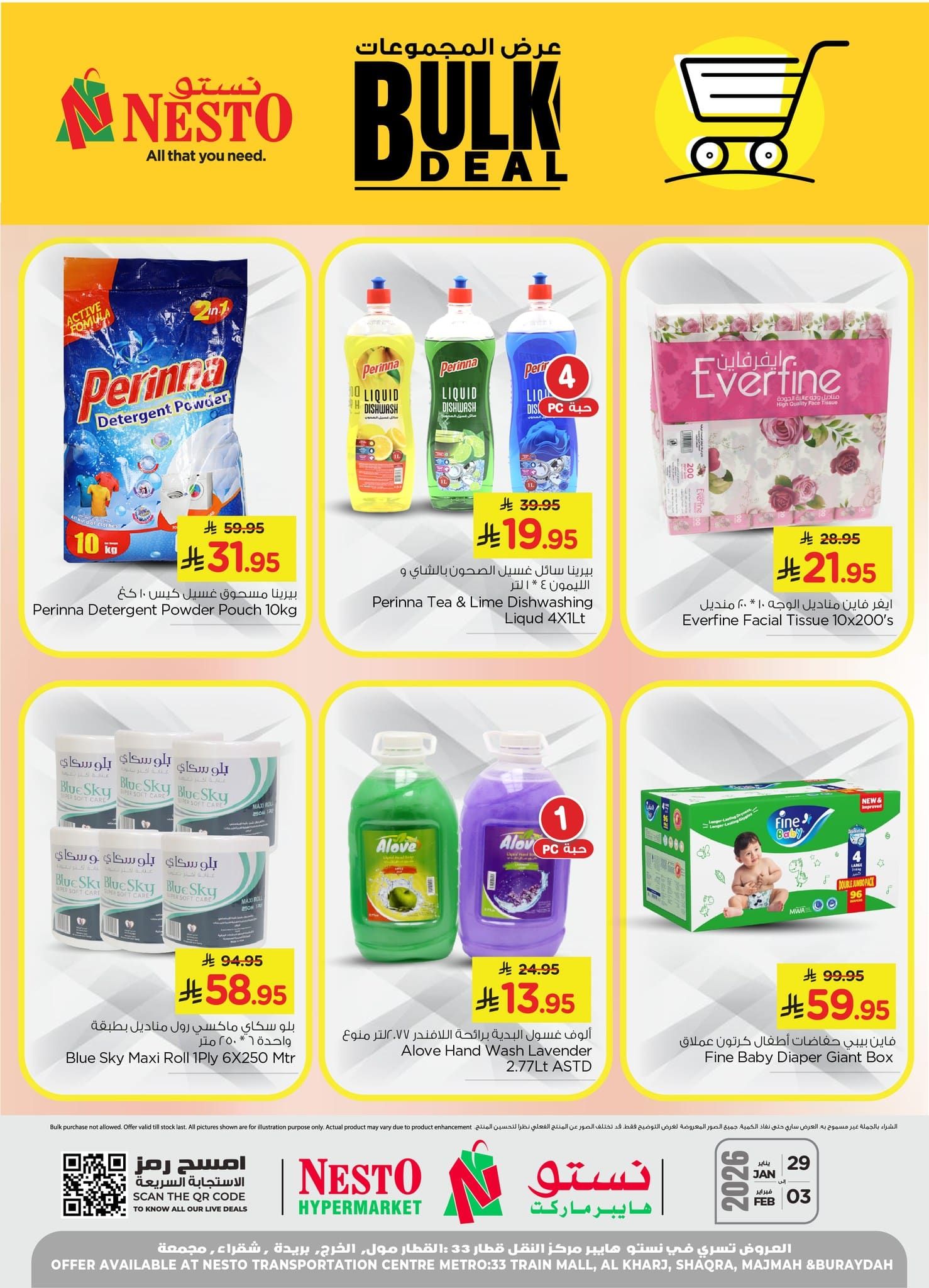نستو الاسبوعية الخميس 10-8-1447هـ الموافق 29 يناير 2026 و تحتوي علي أرز أبو كاس البسمتي وأرز الباخرة وزيوت الطبخ عافية وأبو زهرة ودلال ومعجون طماطم رنا وكاتشب كاتش مي وورق عنب ريم وفاصوليا كاليفورنيا جاردن ومياه أوسكا وطحين كويت وحليب بوني وفيمتو وإندومي بالإضافة إلى منتجات العناية بالمنزل