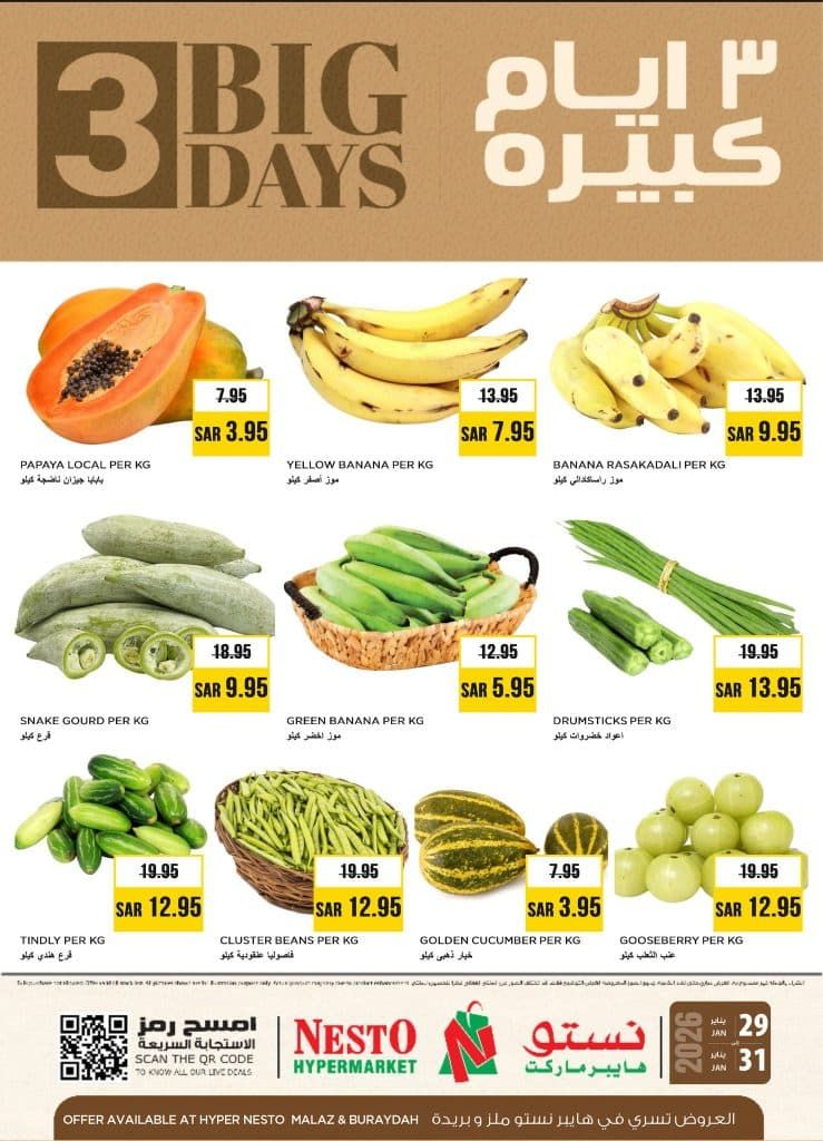 نستو الملز الويكند الخميس 29-1-2026 الموافق 10 شعبان 1447هـ و تحتوي علي بابايا جيزان وموز أصفر وموز راسكادالي وقرع كايو وموز أخضر وأعواد خضروات وقرع هندي وفاصوليا عنقودية وخيار ذهبي وعنب الثعلب بالإضافة إلى أرز مسلوق بوني وأرز تايلاندي وغيرها من المنتجات باقل الاسعار المناسبة للجميع