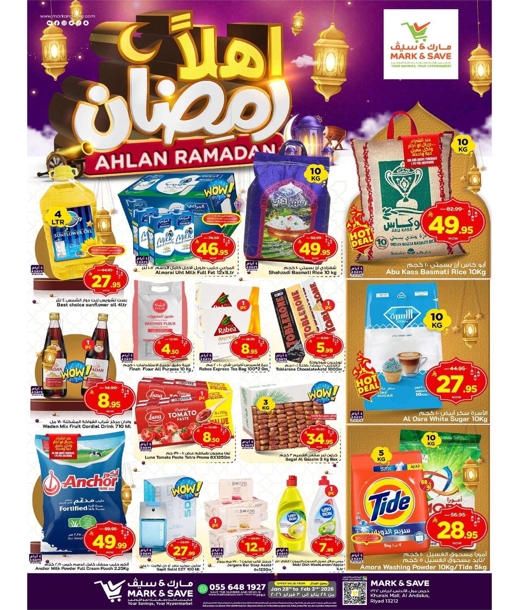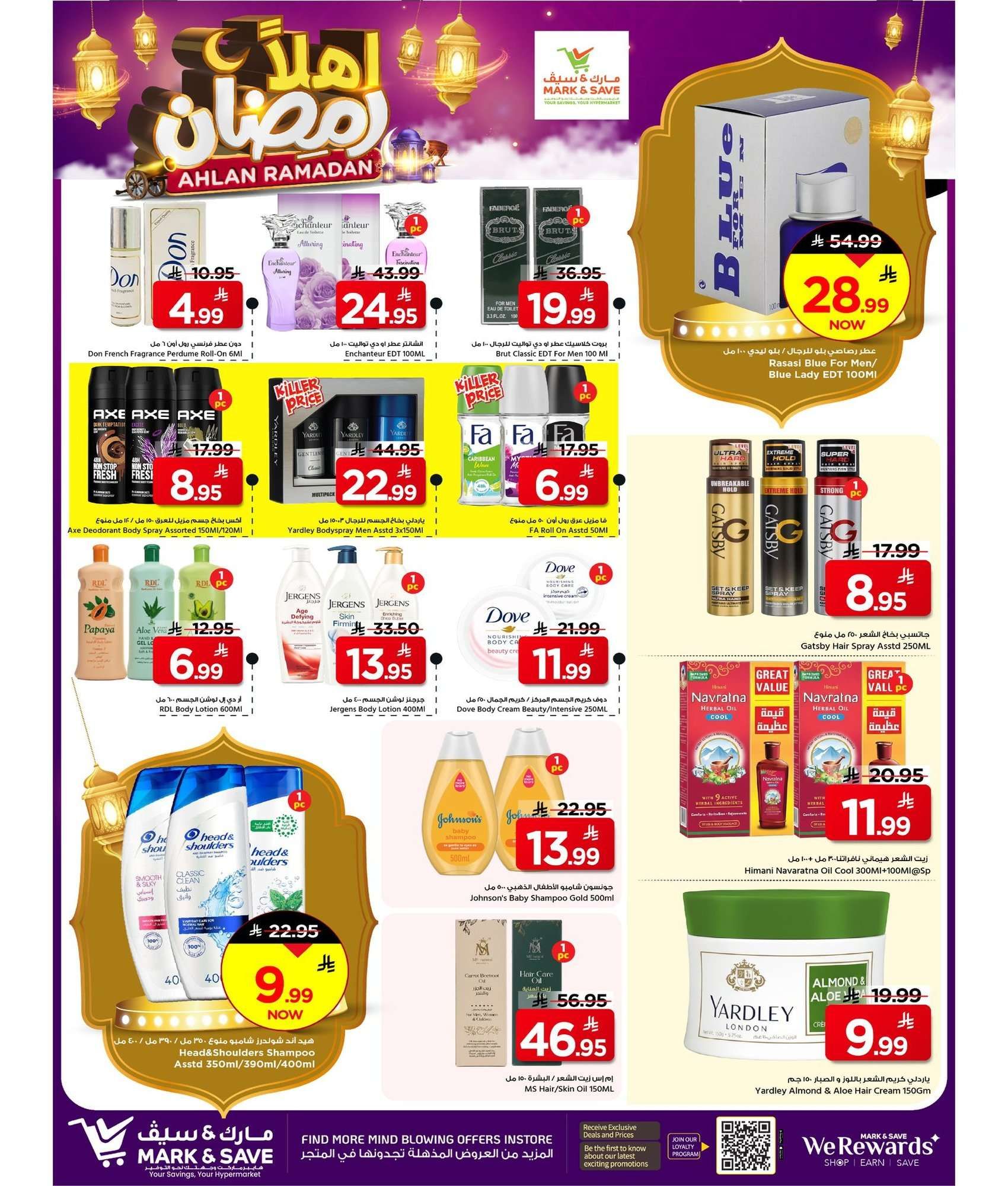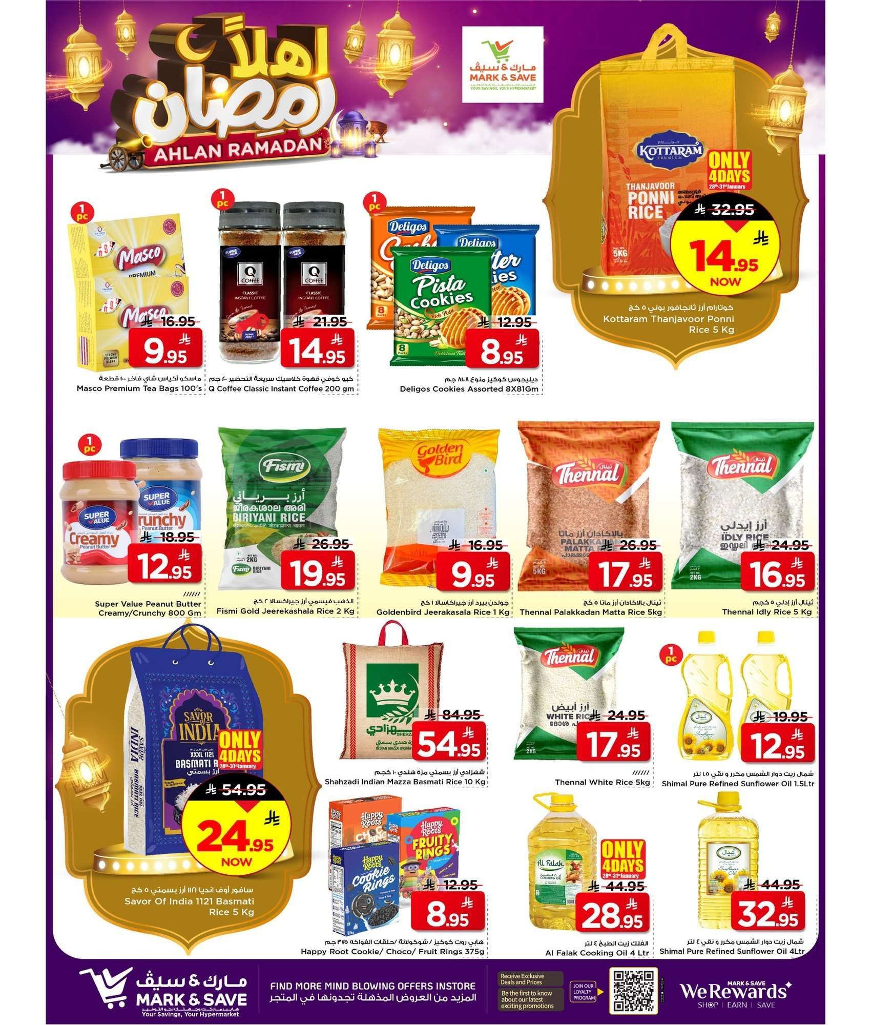 عروض مارك اند سيف الرياض الأربعاء 9-8-1447هـ الموافق 28 يناير 2026 و تشمل سمك الشيلم وزيت عباد الشمس والمكرونة والفاكهة المجففة والأجبان واللحوم الباردة والأرز الهندي والسكر ودقيق البر والحليب والقهوة والشاي وتتبعها الأجهزة المنزلية منها غسالة صحون ومفرمة خضروات وشواية كهربائية ومكواة ملابس وشاشة ذكية ومحضر طعام وقلاية هوائية